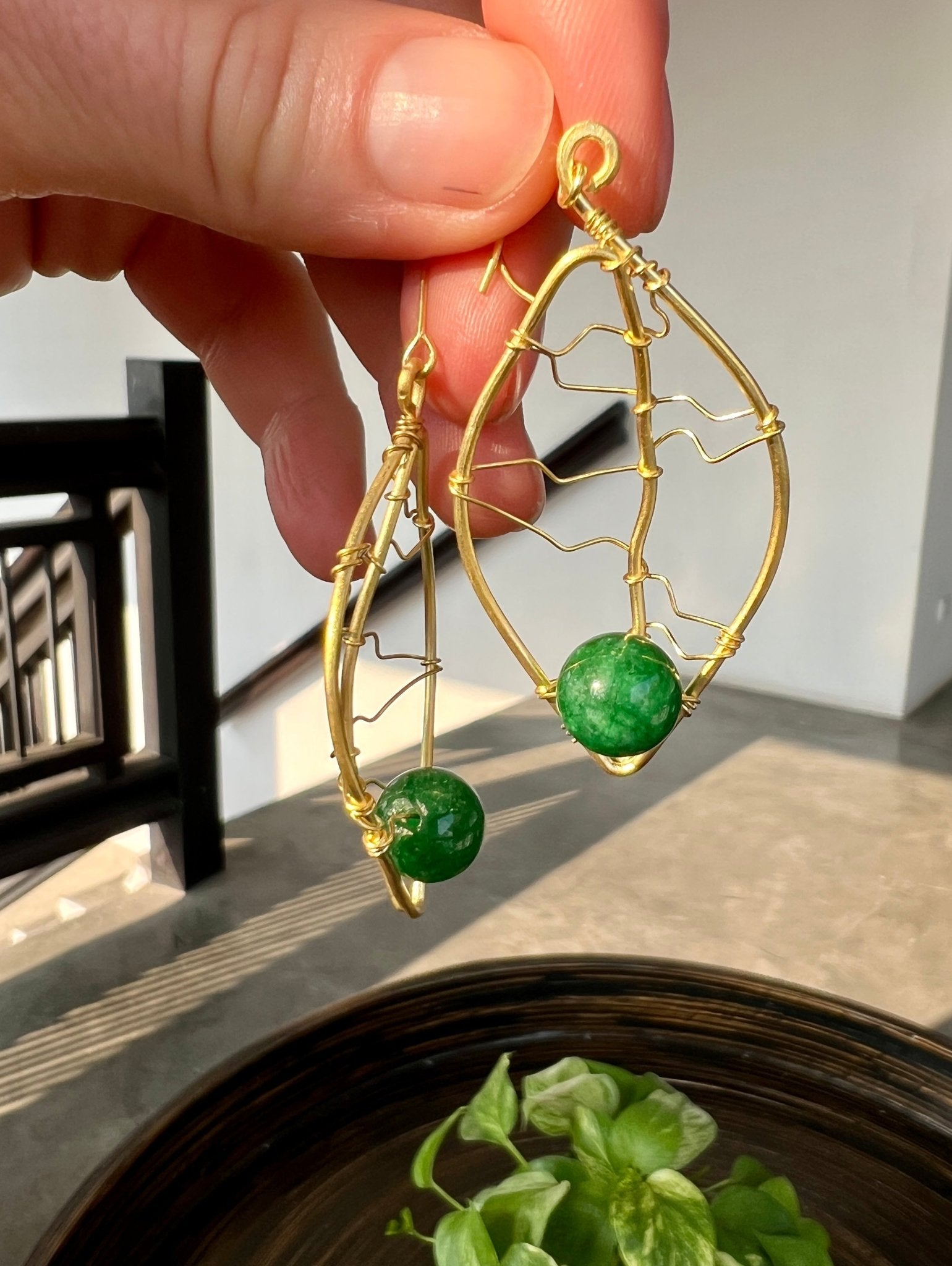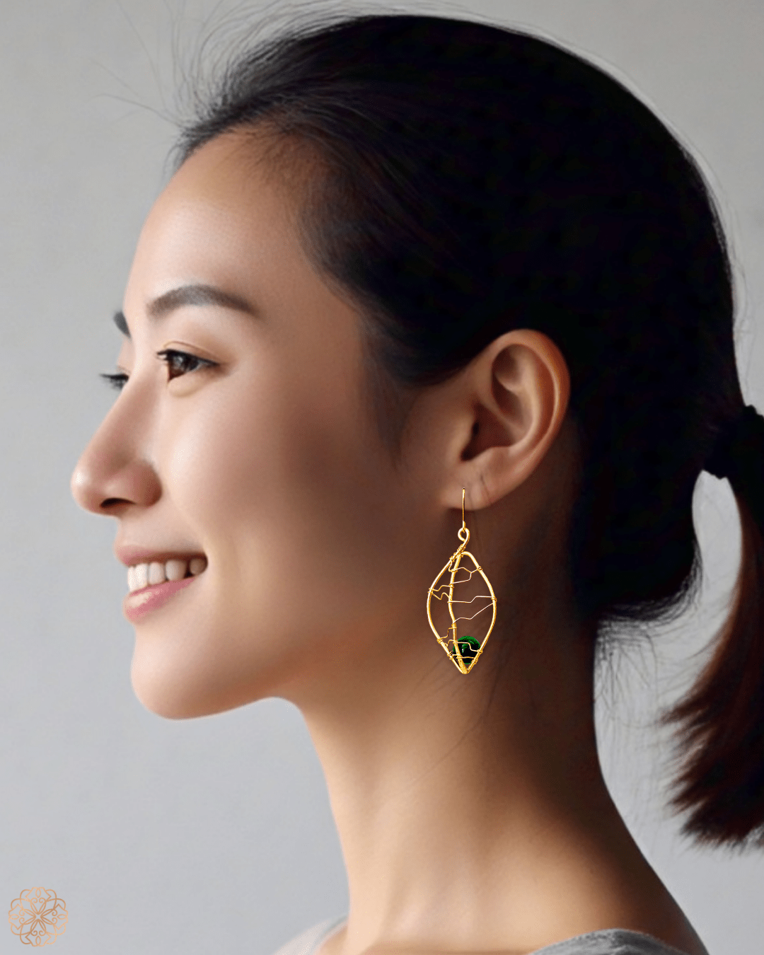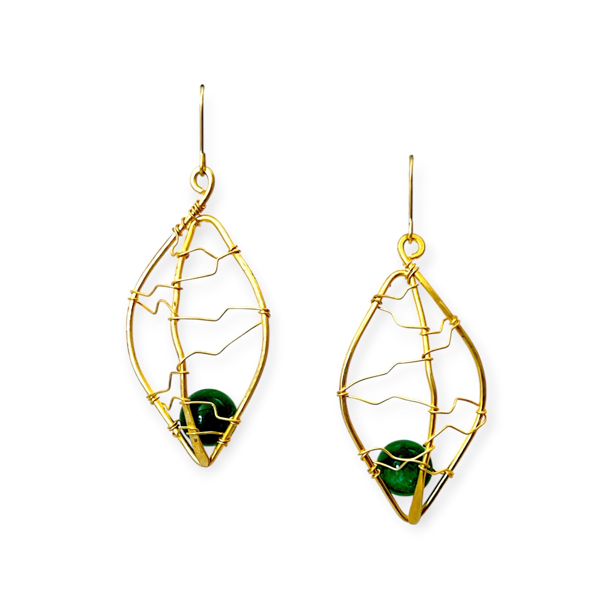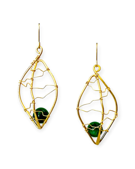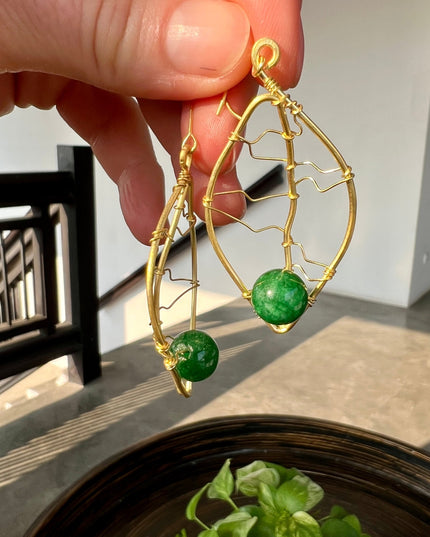 Delicately sculpted with an open weave design, these airy leaf-inspired drop earrings offer a graceful silhouette with a burst of vibrant color. A brilliant green chalcedony gemstone is nestled at the base, adding depth and a refreshing pop against the warm brass tones.