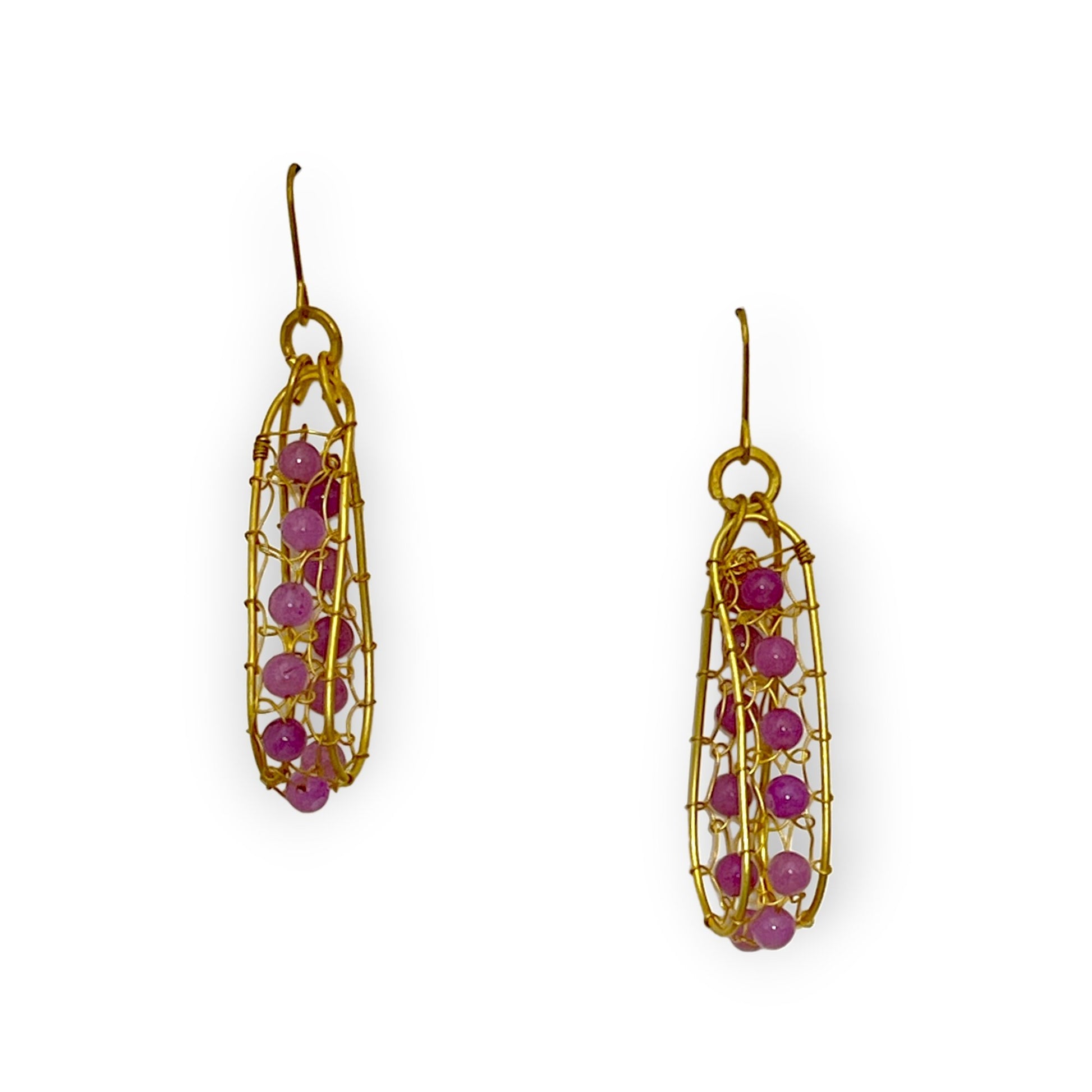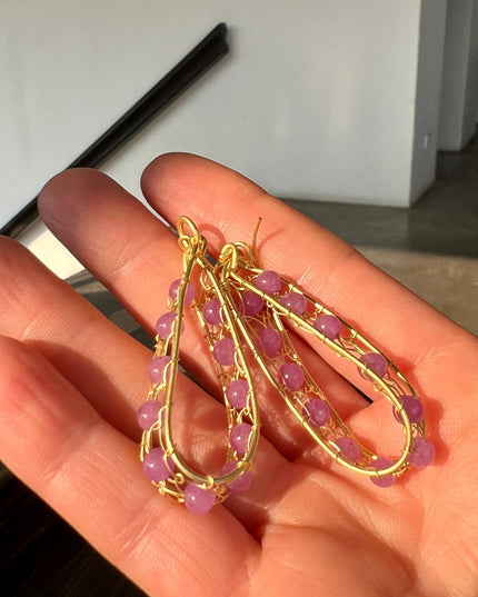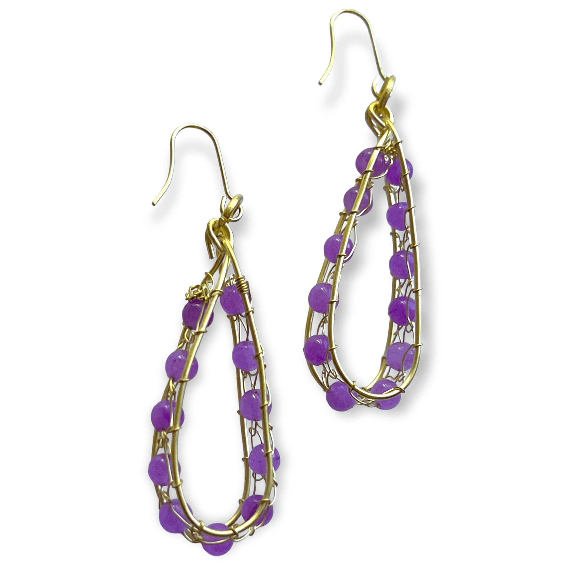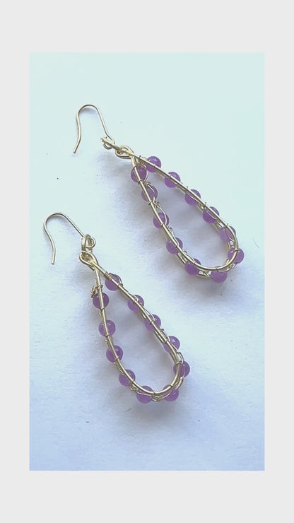 Elegant with a twist, these handmade amethyst hoop drop earrings bring the perfect pop of purple to your look. Featuring delicately beaded amethyst gemstones arranged in a teardrop silhouette, they offer a dimensional, modern design that’s stylish without shouting.