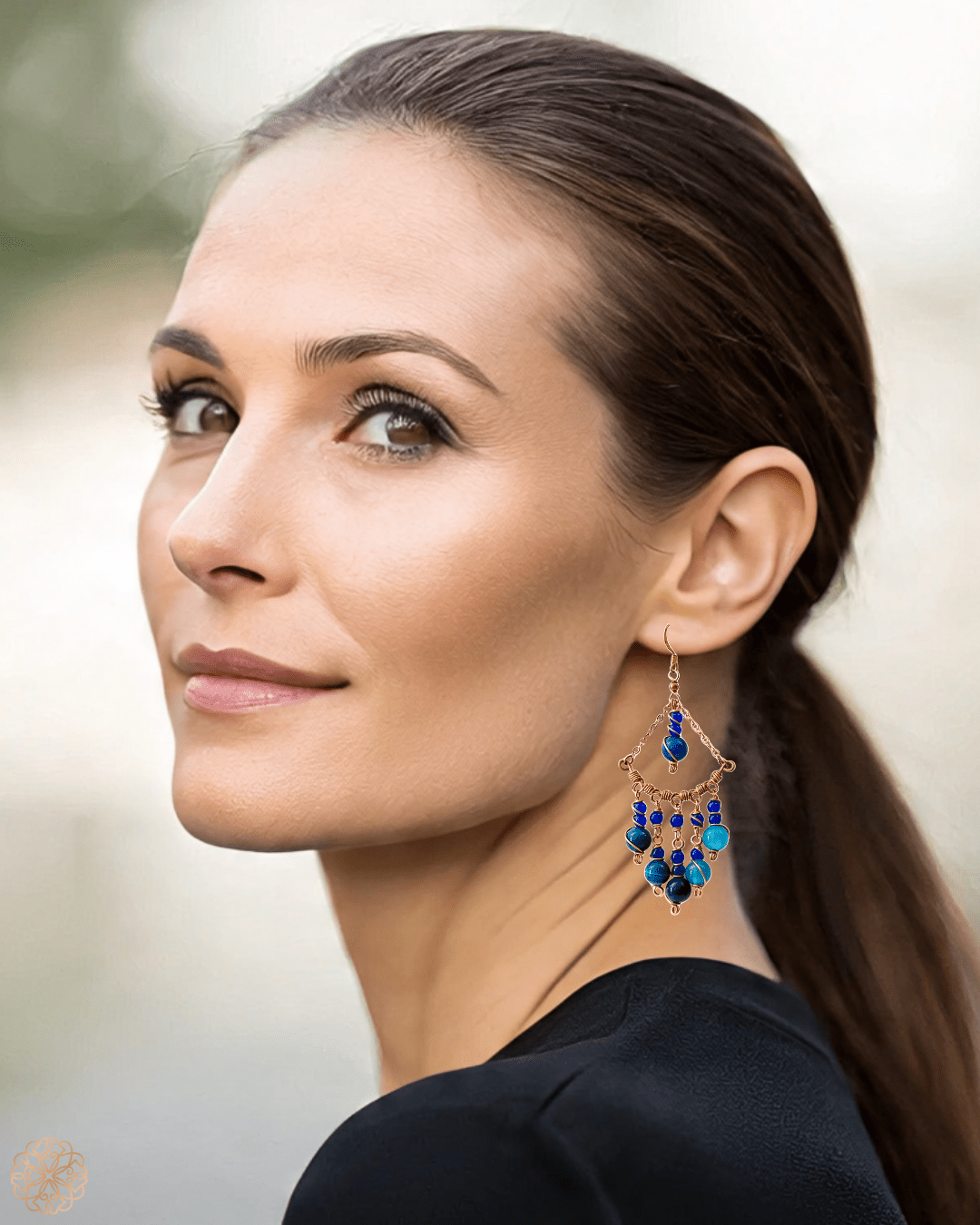 These beaded drop chandelier earrings are a joyful celebration of color, texture, and artistic spirit. Designed with a distinct boho vibe, each earring features four gemstone strands—a vibrant cascade of howlite, larimar, agate, and brass; anchored by a delicate cluster of stones at the apex, creating a look that’s equal parts dramatic and free-spirited.