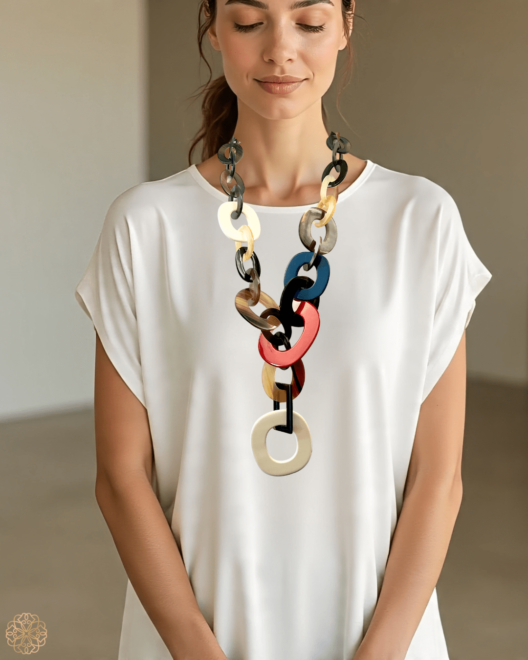 Make your wardrobe pop with this bold chainlink statement necklace—a truly unique piece designed to add a vibrant, sculptural edge to any look. Carefully crafted from natural horn, each link showcases subtle variations in color and texture that ensure no two necklaces are exactly alike, making yours a one-of-a-kind treasure.