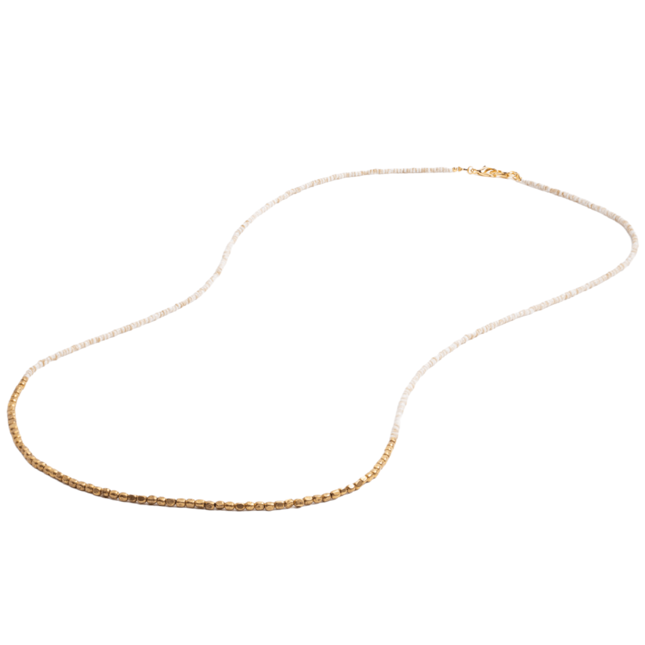 Earthy, elegant, and quietly luxurious, this handcrafted brass and quartz necklace is one of those rare pieces that feels essential the moment you put it on. Meticulously composed of warm brass and natural quartz beads, its understated palette offers a grounded sophistication—perfect worn solo or layered with other favorites.