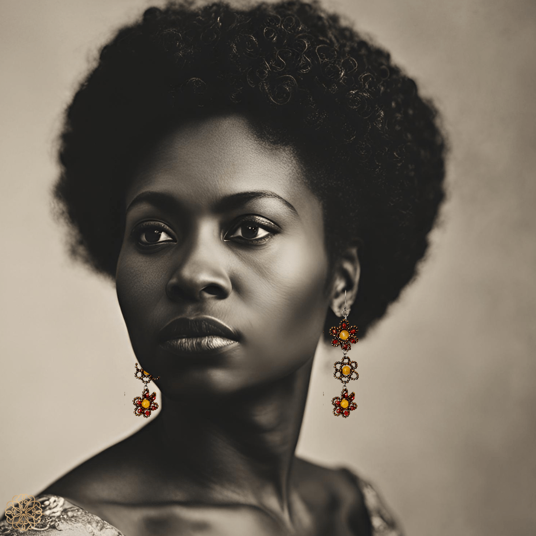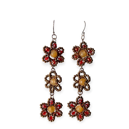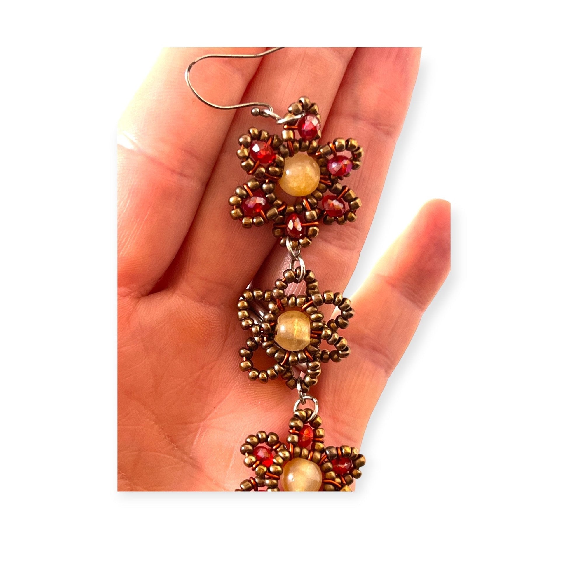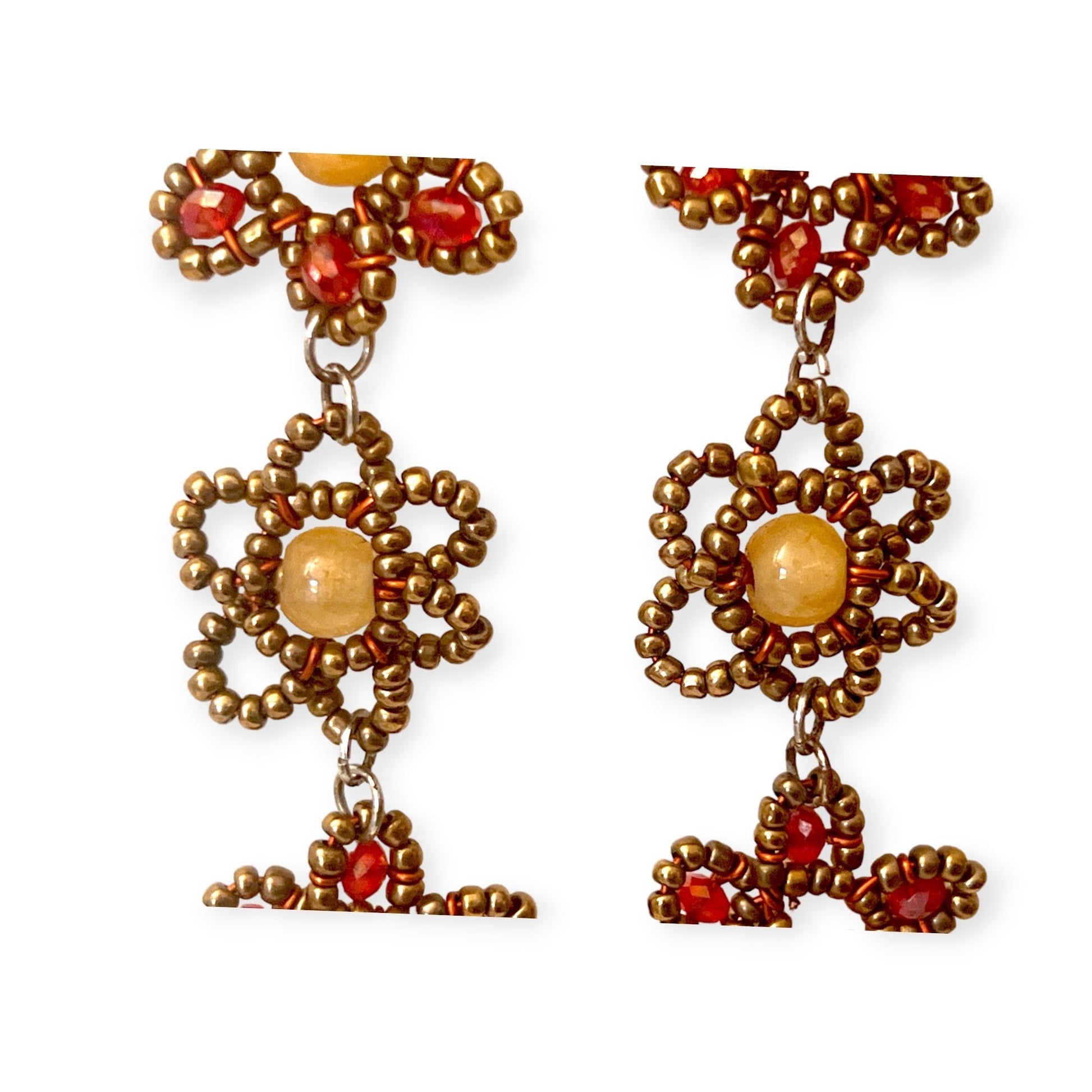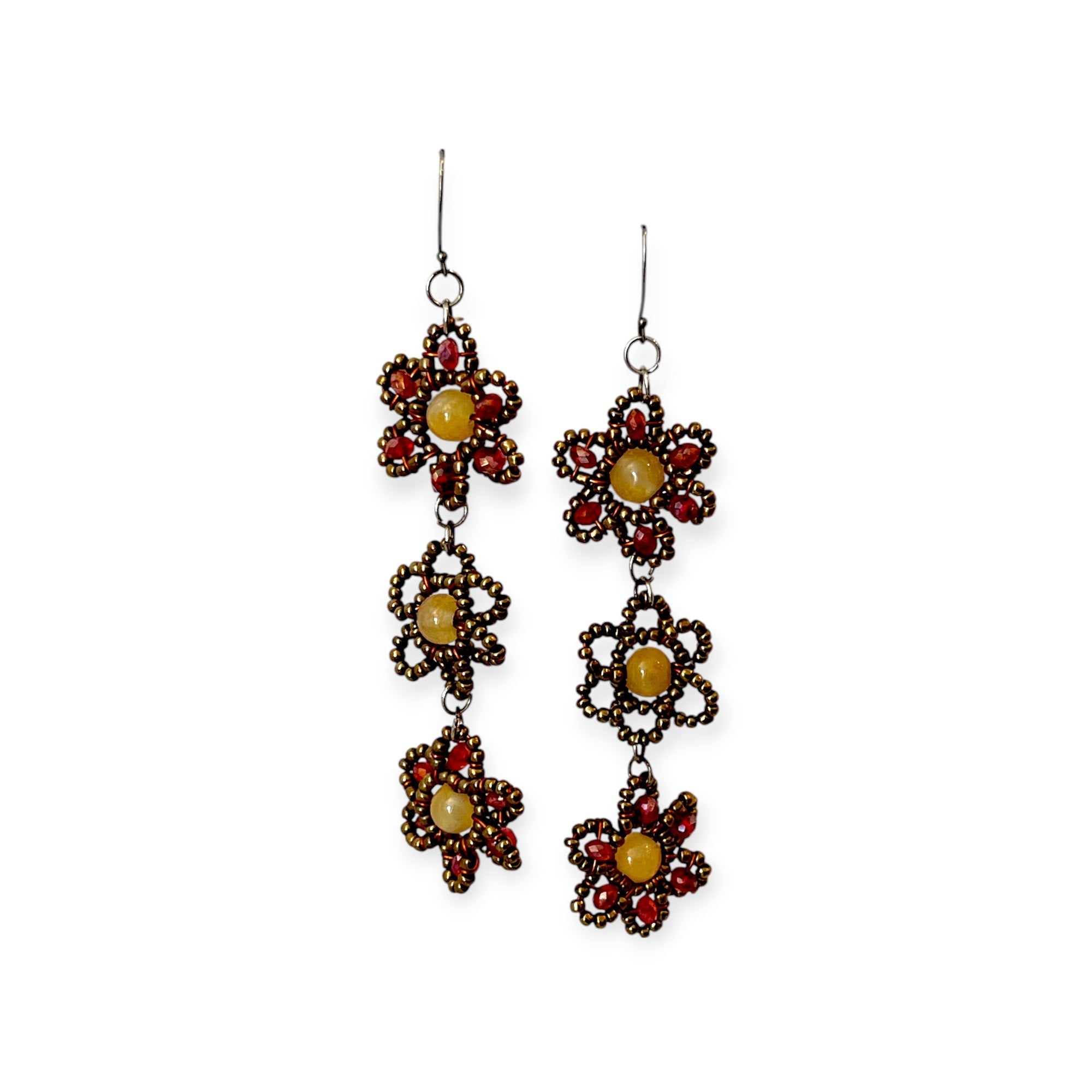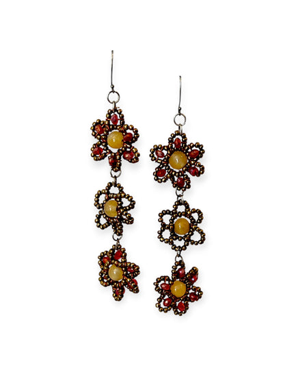 A cascade of amber blossoms brings luminous warmth and movement to these handcrafted statement earrings. Each flower is formed from glowing amber beads, accented with delicate seed beads for added texture and depth. Suspended in tiers, the design evokes a garden in bloom—fluid, organic, and full of light.