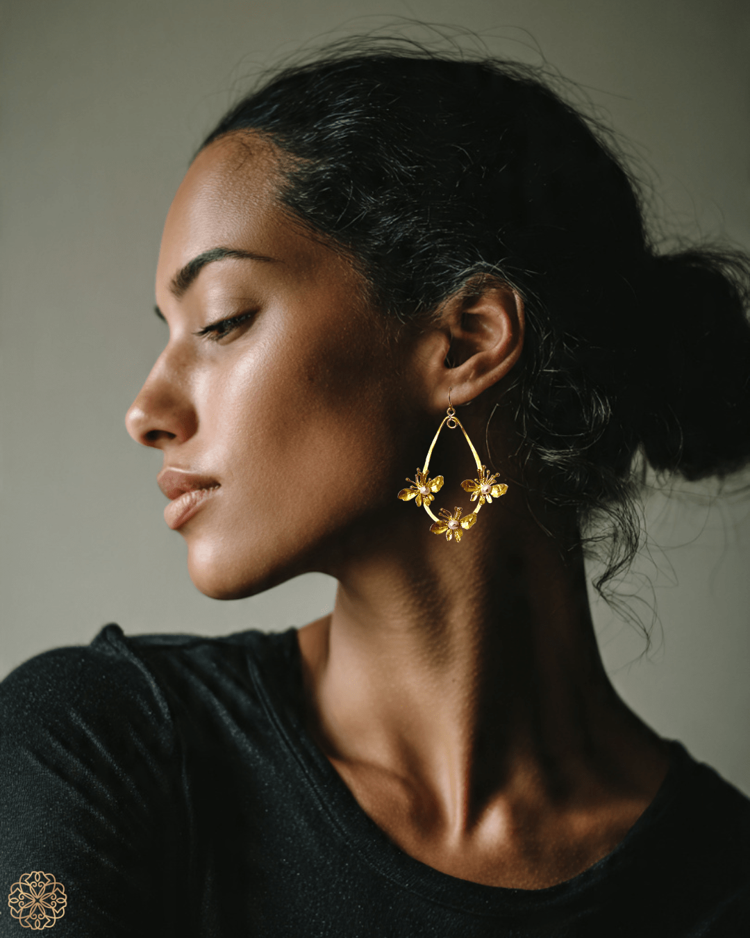 Handcrafted by a gifted solo designer, each earring features a brass hoop adorned with three delicate blossoms, each cradling a lustrous pearl at its center. The nature-inspired design is both whimsical and elegant, creating a soft statement that’s perfect for anyone who loves pieces that feel one-of-a-kind—because this pair is.