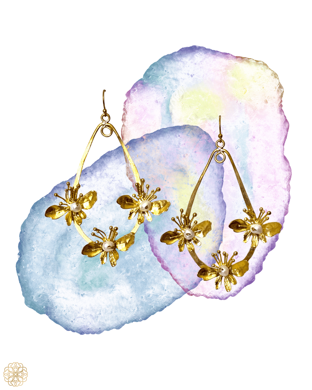 • Each hoop features three handcrafted brass blossoms with pearls