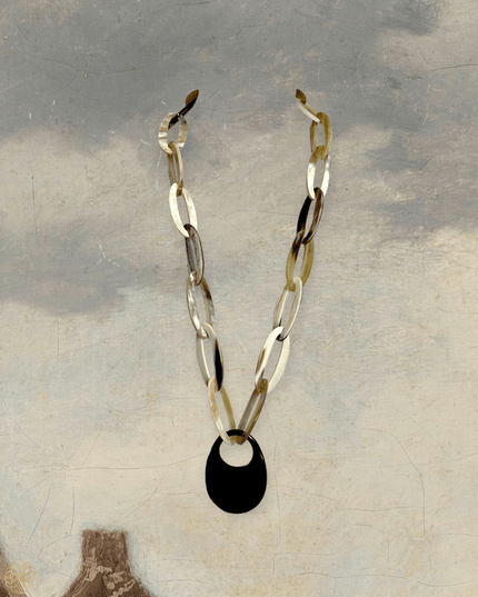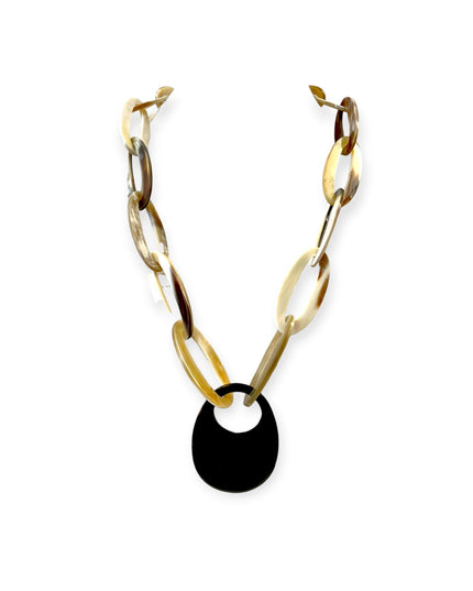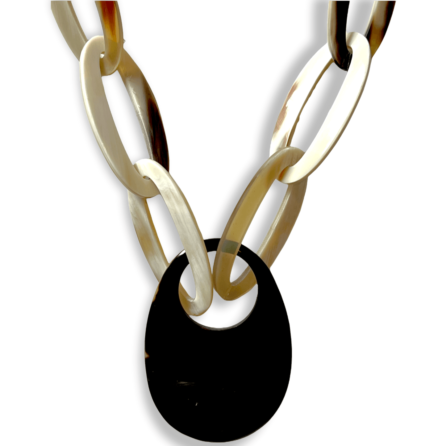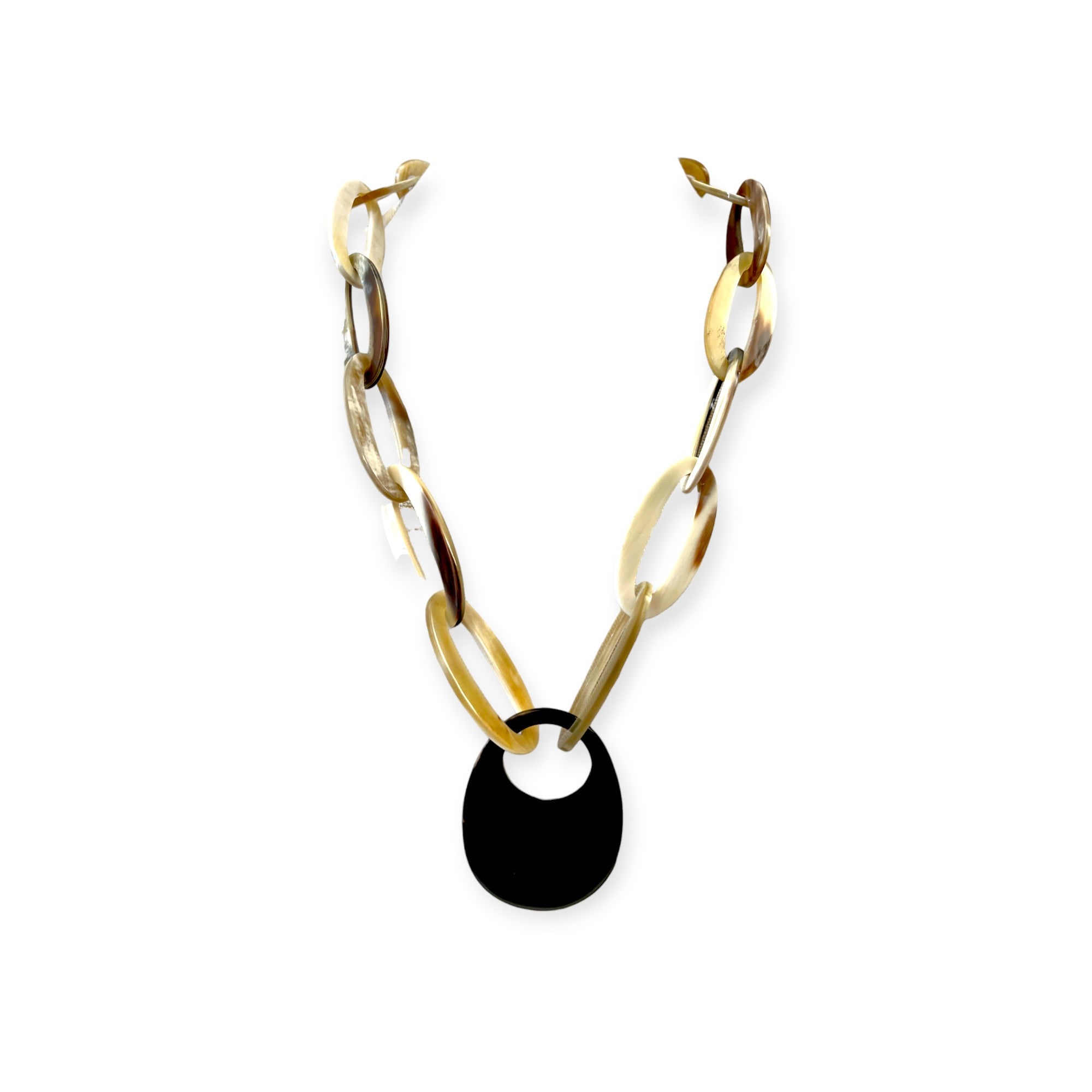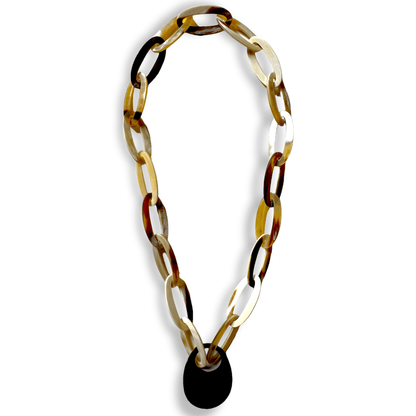 Striking yet versatile, this handcrafted horn necklace makes a statement without overpowering. A bold chainlink design flows into a substantial pendant, its organic patterning and warm, variegated tones highlighting the natural beauty of horn. No two pieces are alike, ensuring yours is truly unique.
