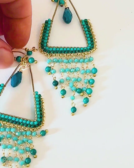 These handcrafted drop earrings are a joyful expression of color, texture, and artistry. At the top, a triangular brass form anchors a woven band of tiny beads. From this base, vibrant strands of gemstones and crystals sway with every step—bringing eye-catching movement and charm to your look.