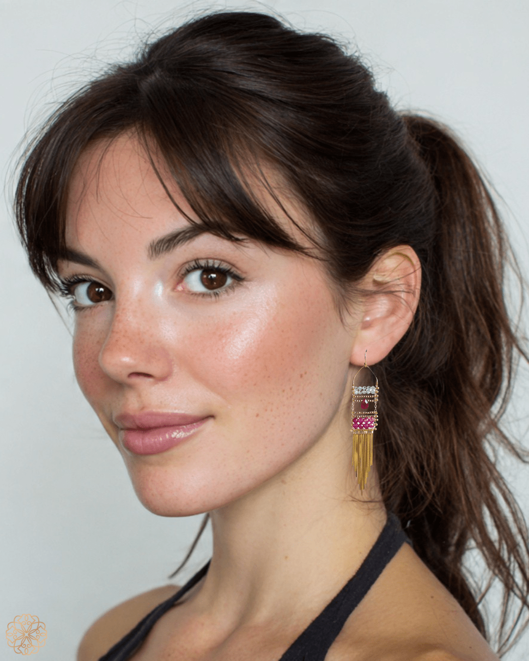 The second layer of gemstone beads leads to slender brass strips that sway gently with your movement, adding a touch of fluidity and shimmer.