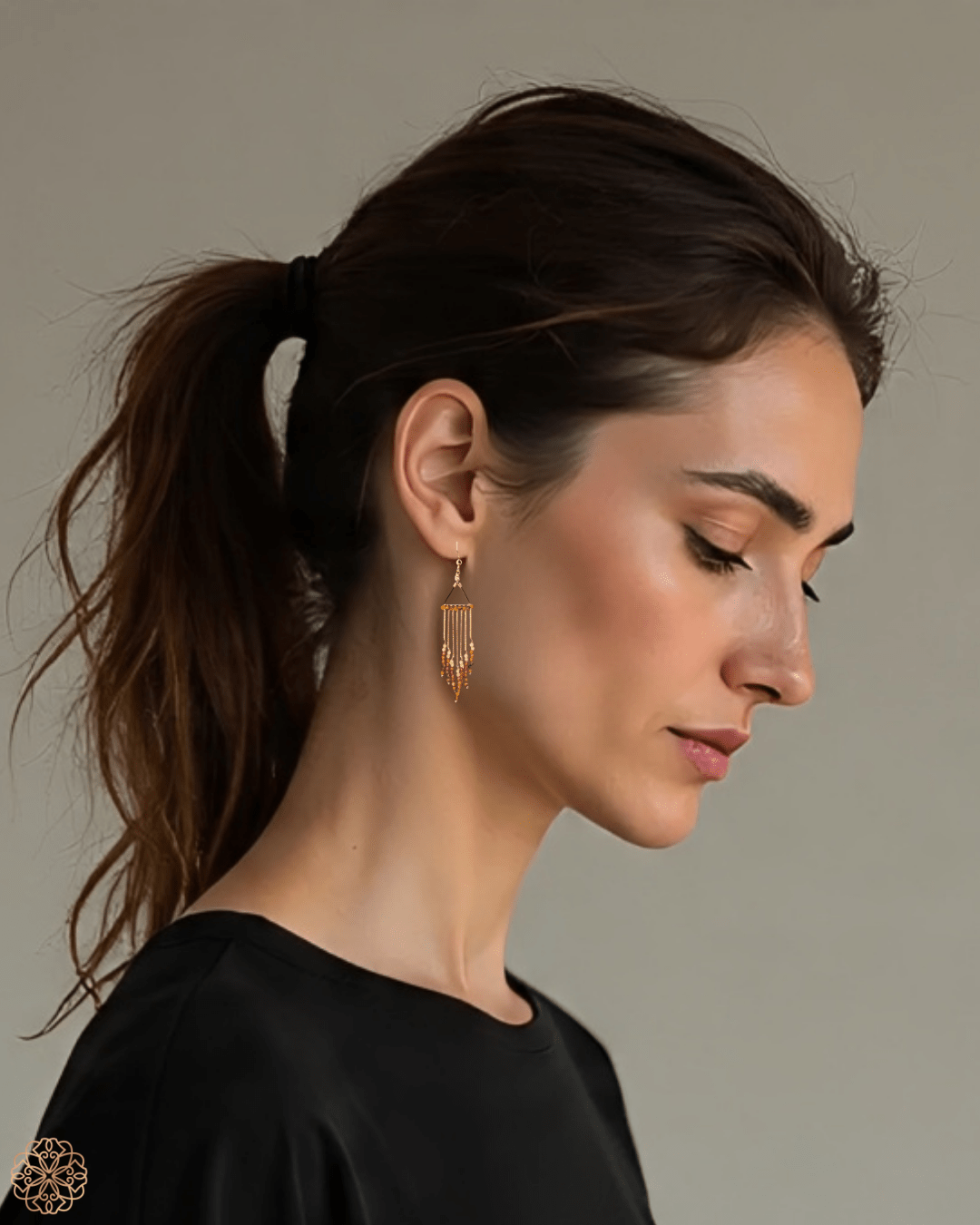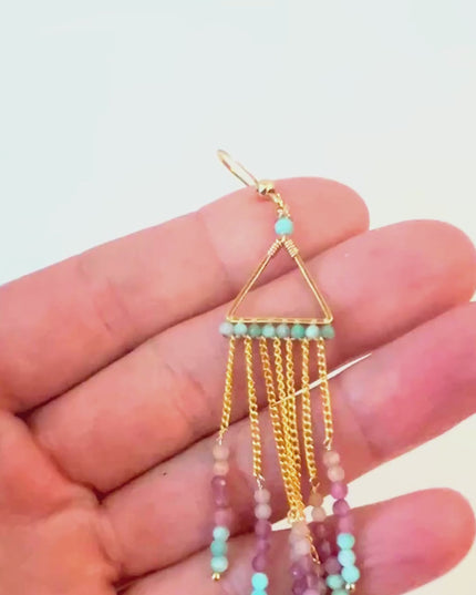 Turn any outfit into a celebration of color with these handmade colorful beaded earrings, crafted to capture attention and delight the senses. Each pair starts with a sleek brass triangle at the ear, from which multiple strands fan out—each strand threaded with richly hued gemstone beads that contrast and catch the light. The result is a concentrated burst of color and movement, perfect for day-to-day wear or making a bold entrance.