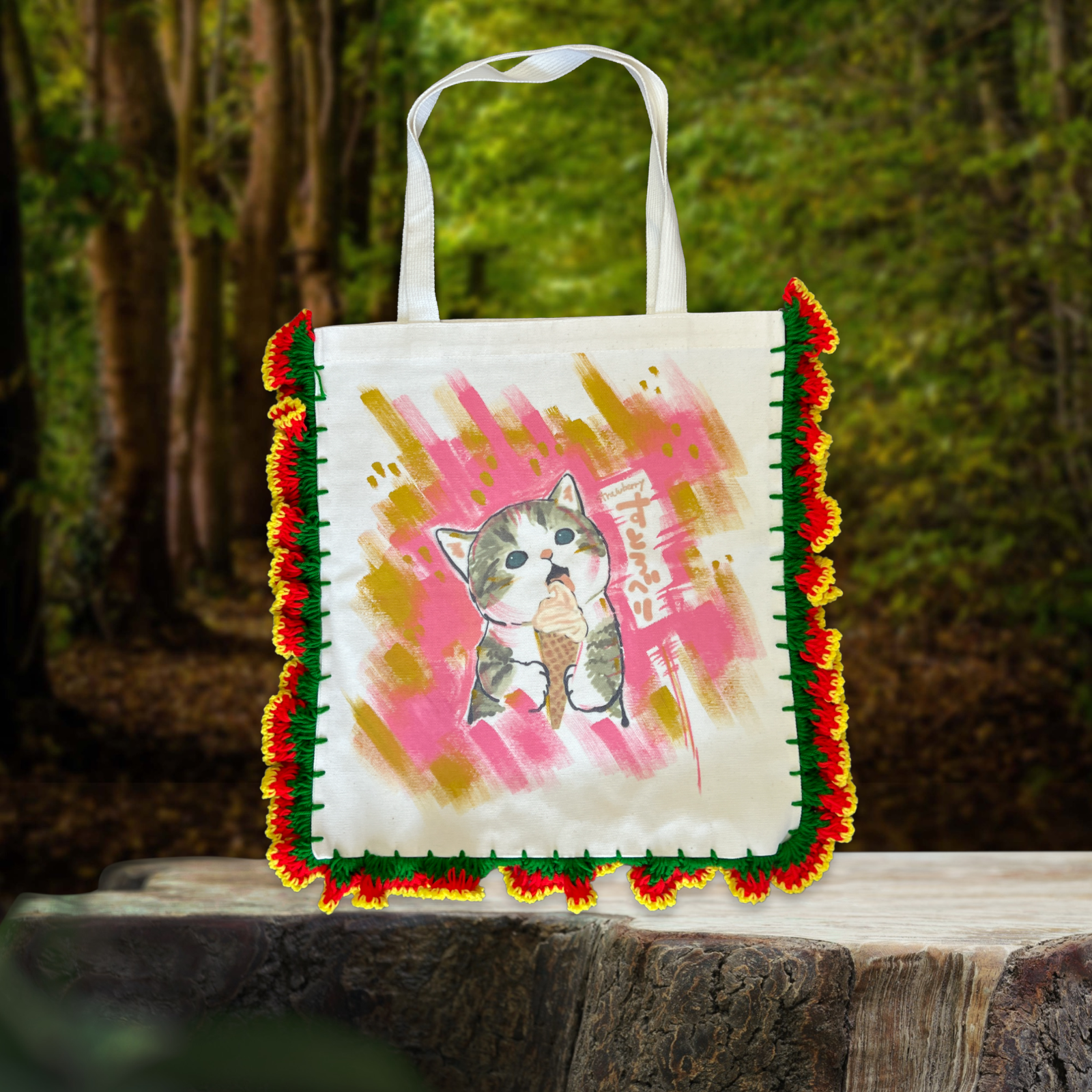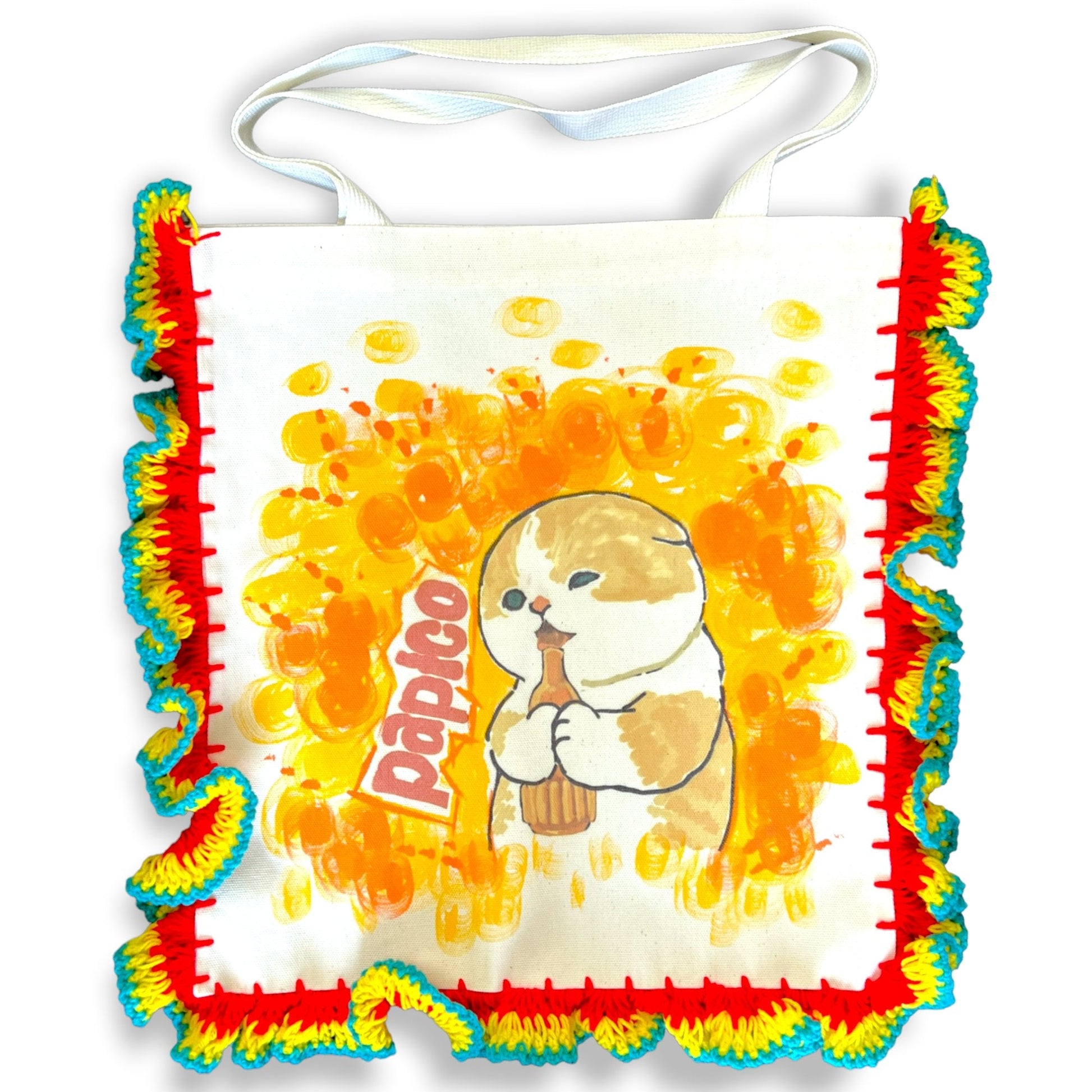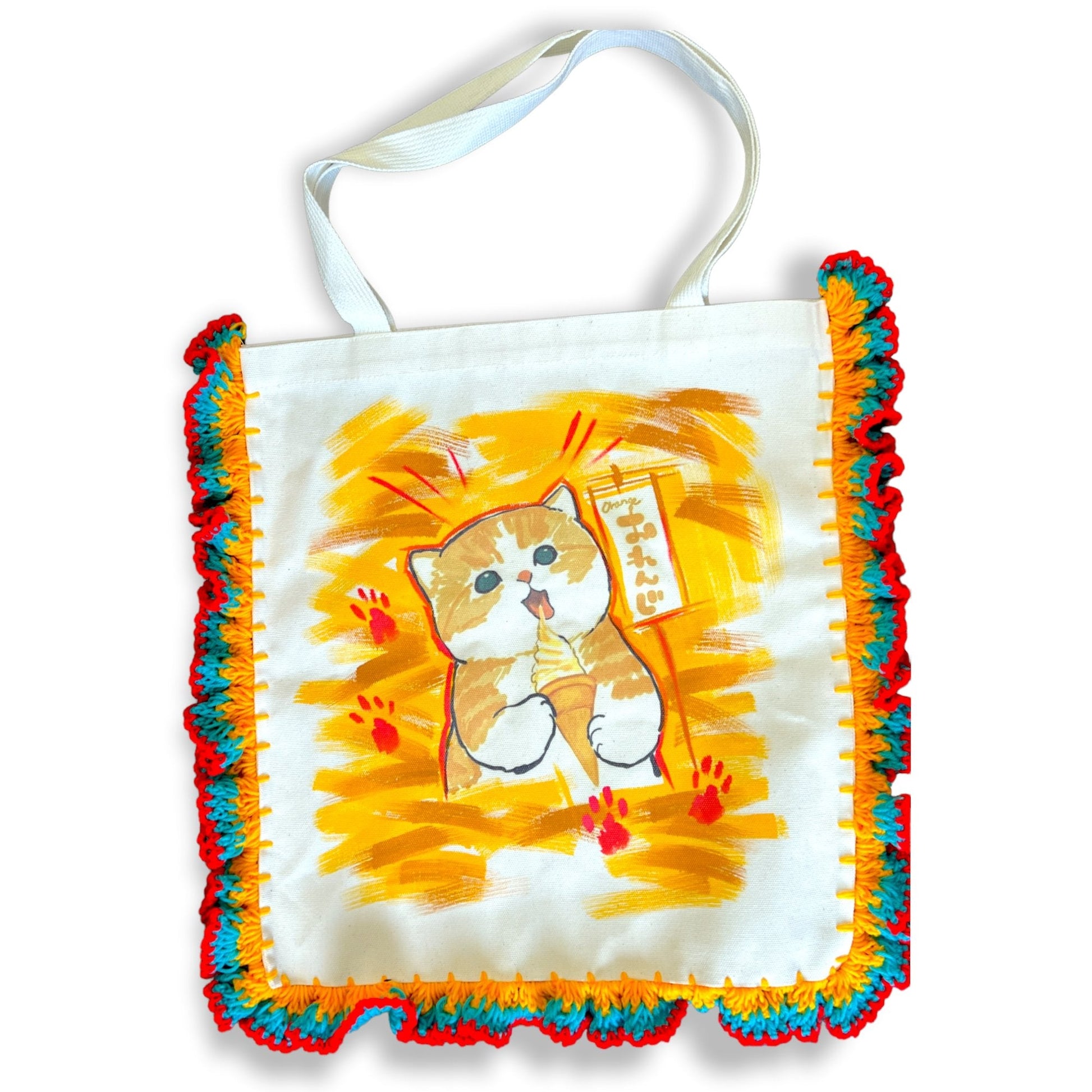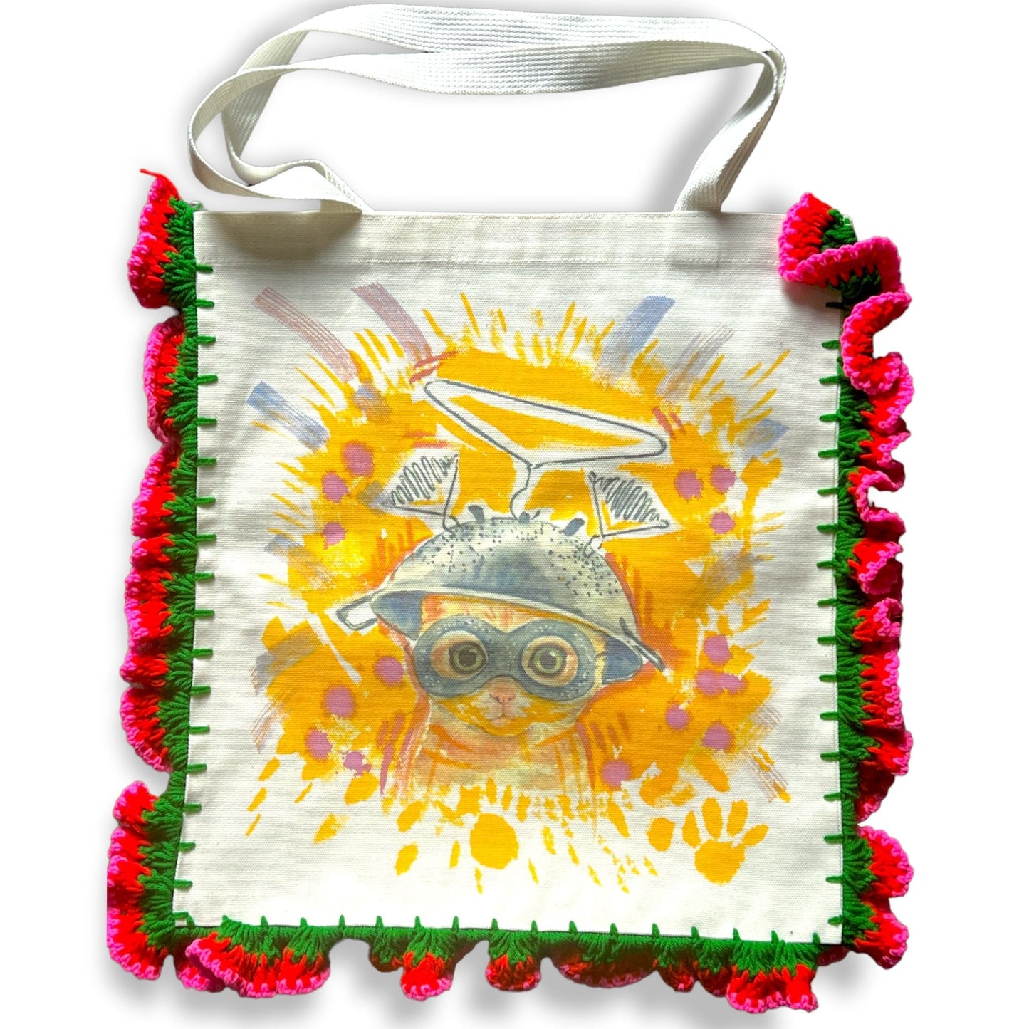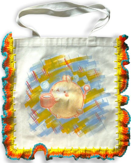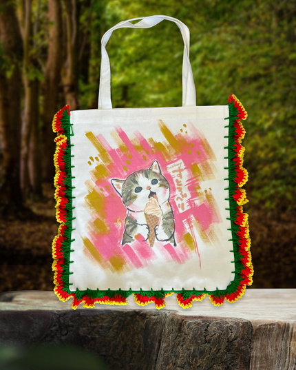 Add a burst of personality to your day with these Colorful Characters Canvas Bags, lovingly handmade by a gifted fabric artist in Thailand. Each bag is crafted from sturdy cotton fabric and accented with vibrant yarn crochet around the edges, perfectly framing the cheerful, whimsical characters illustrated on the front.