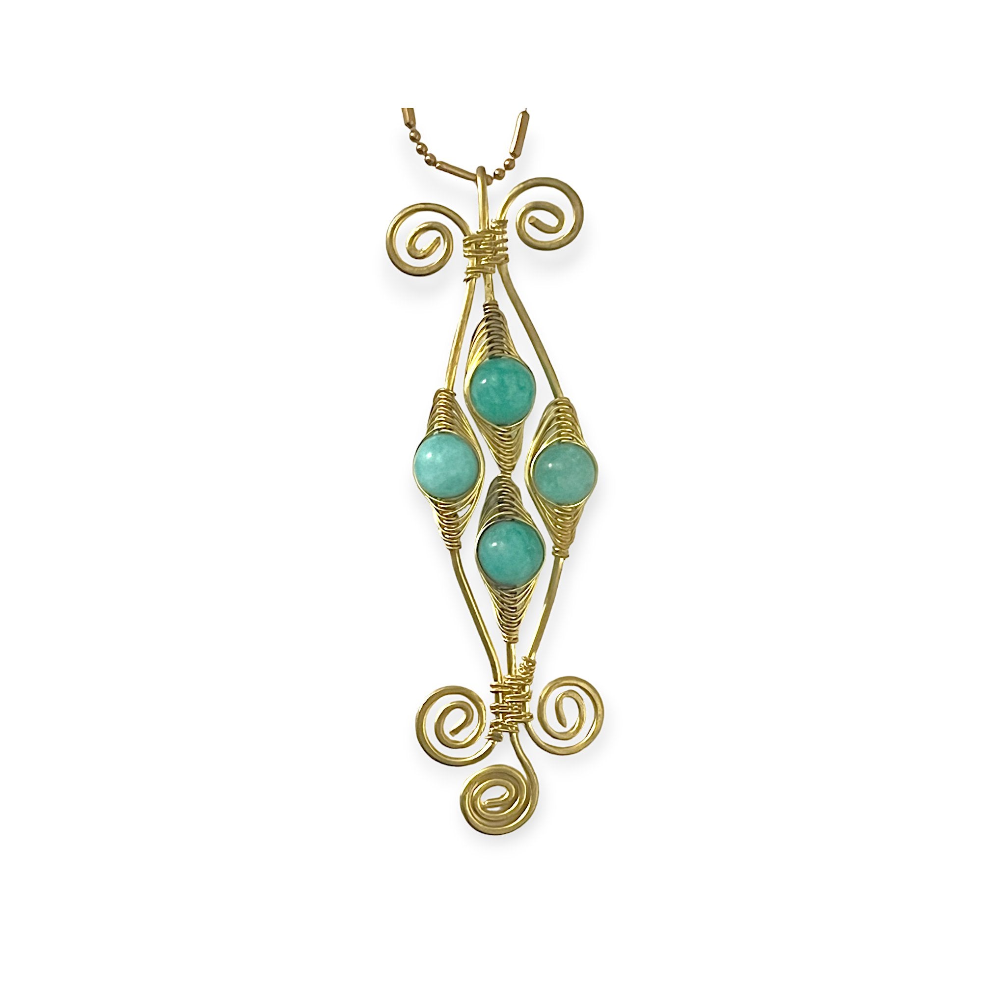 The pendant features a woven diamond-shaped base accented with four complementary gemstones in an intricate, interlocked design—an elegant balance of raw earthiness and refined style. It hangs from a matinee-length brass chain, giving it just the right length for layering or making a standalone statement.