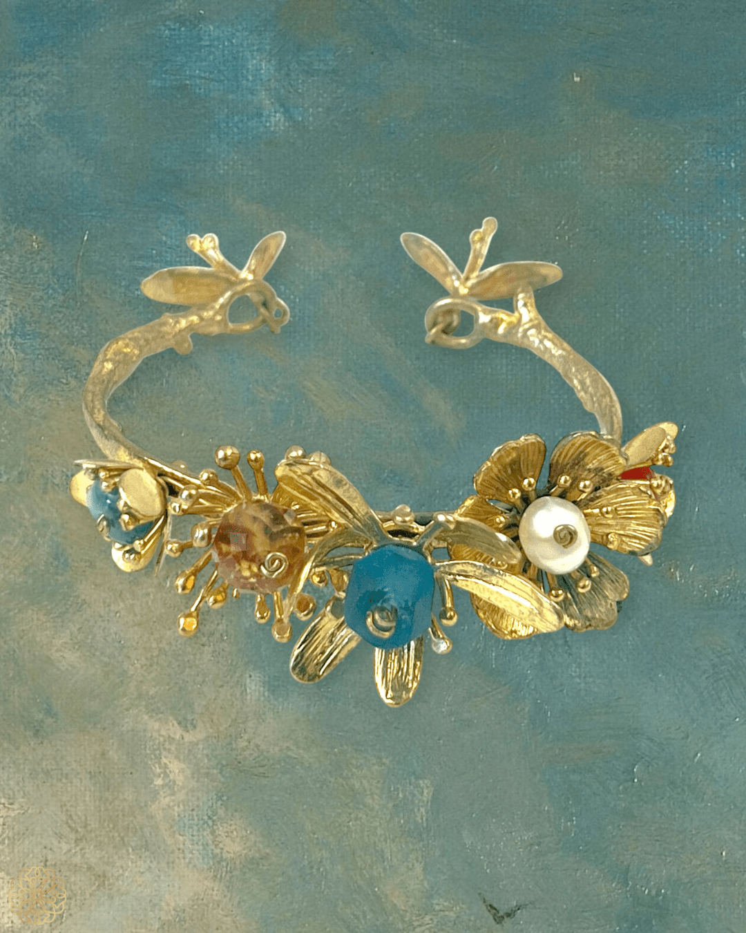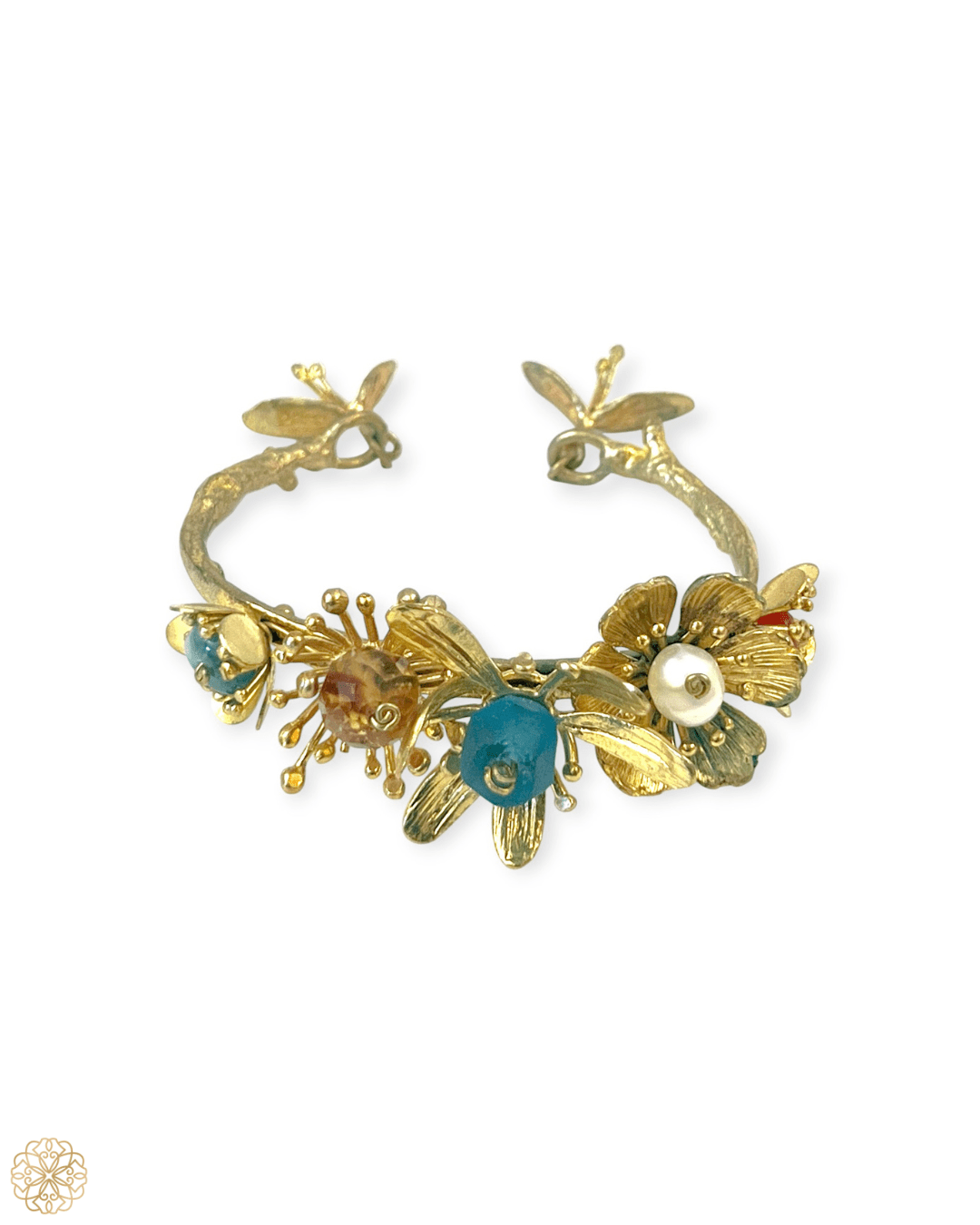 Bring a burst of nature’s beauty to your wrist with this Colorful Floral Cuff Bracelet—a joyful, garden-inspired piece handcrafted with creativity and care. The cuff itself is shaped like a textured brass branch, adorned with a vibrant arrangement of gemstones and delicate floral motifs that blossom across the top. Each end of the cuff is finished with a detailed floral accent, completing the naturalist story in brass.