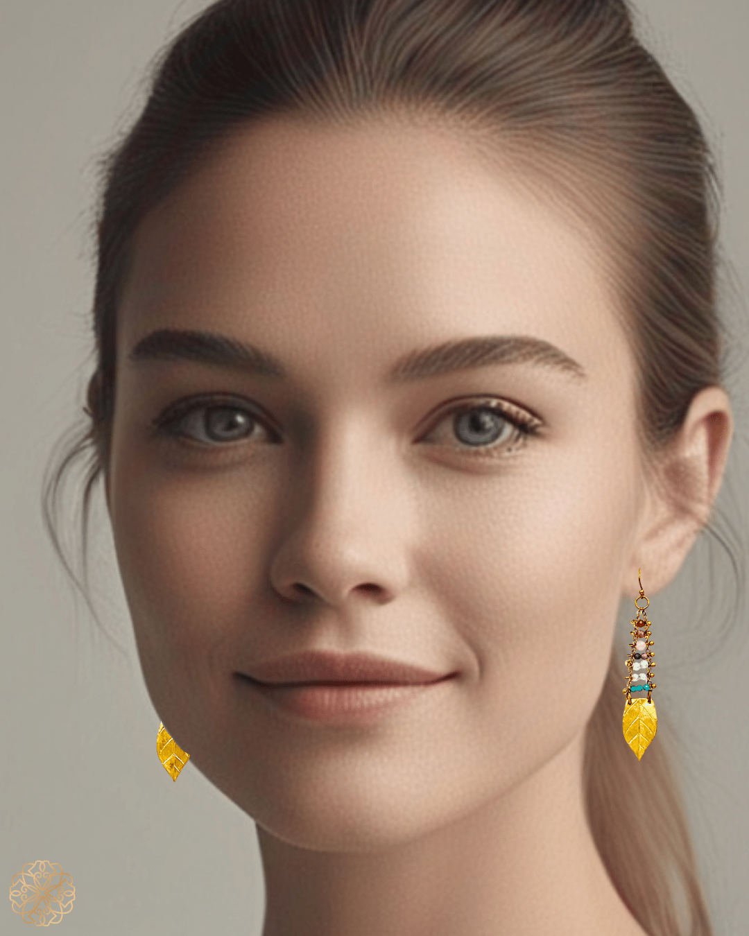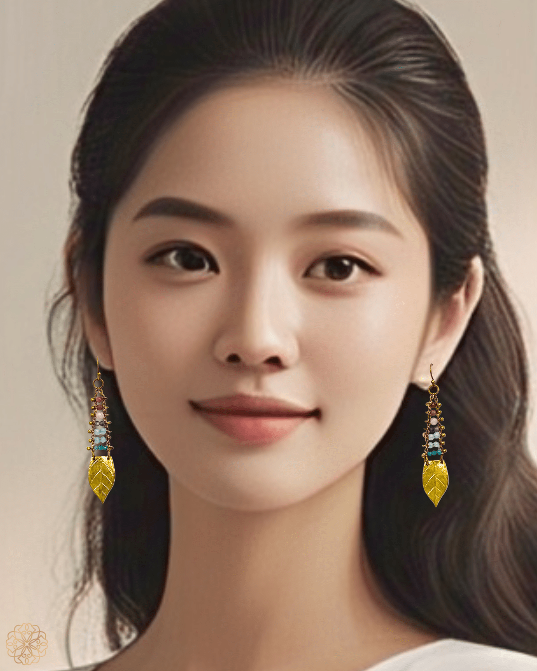 Design: Colorful leaf-inspired drop earrings with intricate gemstone beading