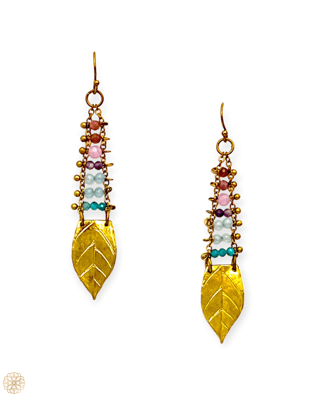 Striking Colorful Leaf Drop Earrings — Wearable Art in Gemstone and Brass