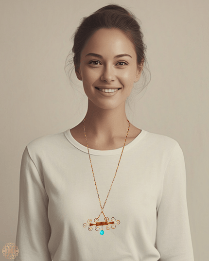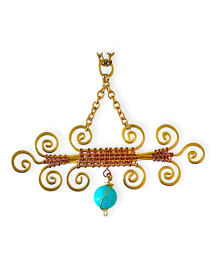 Make a statement with this one-of-a-kind pendant necklace, featuring a beautifully bold scroll-like design handcrafted from woven brass and copper. The interplay of metals creates warmth and texture, while a single suspended amazonite bead delivers a striking pop of cool blue at the center.