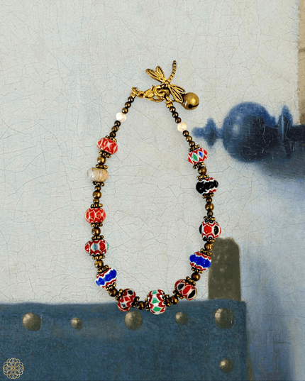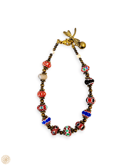 – One-of-a-kind bracelet with colorful trade beads and brass accents