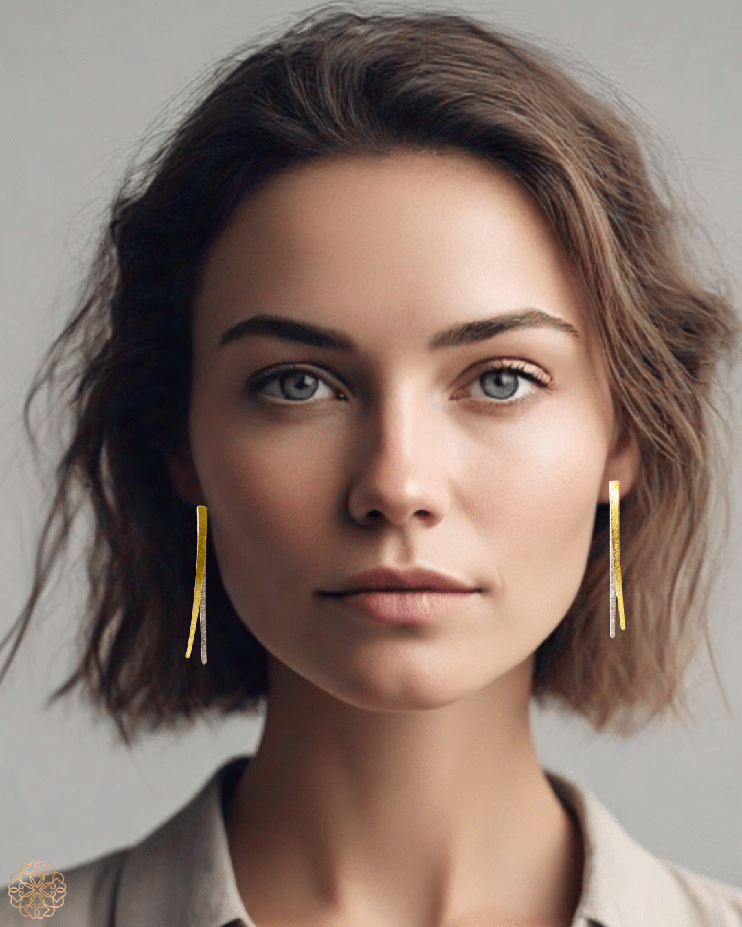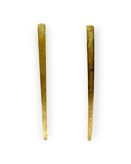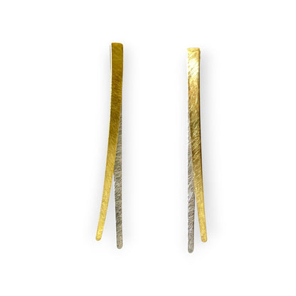 Each pair features two slim, brushed-metal stripes—one in warm brass, the other in cool silver-plated brass—suspended with clean lines that emphasize simplicity and subtle movement. But the true magic lies in their customizable design: the silver stripe can be removed for days when you want an understated all-brass look, making them two styles in one.