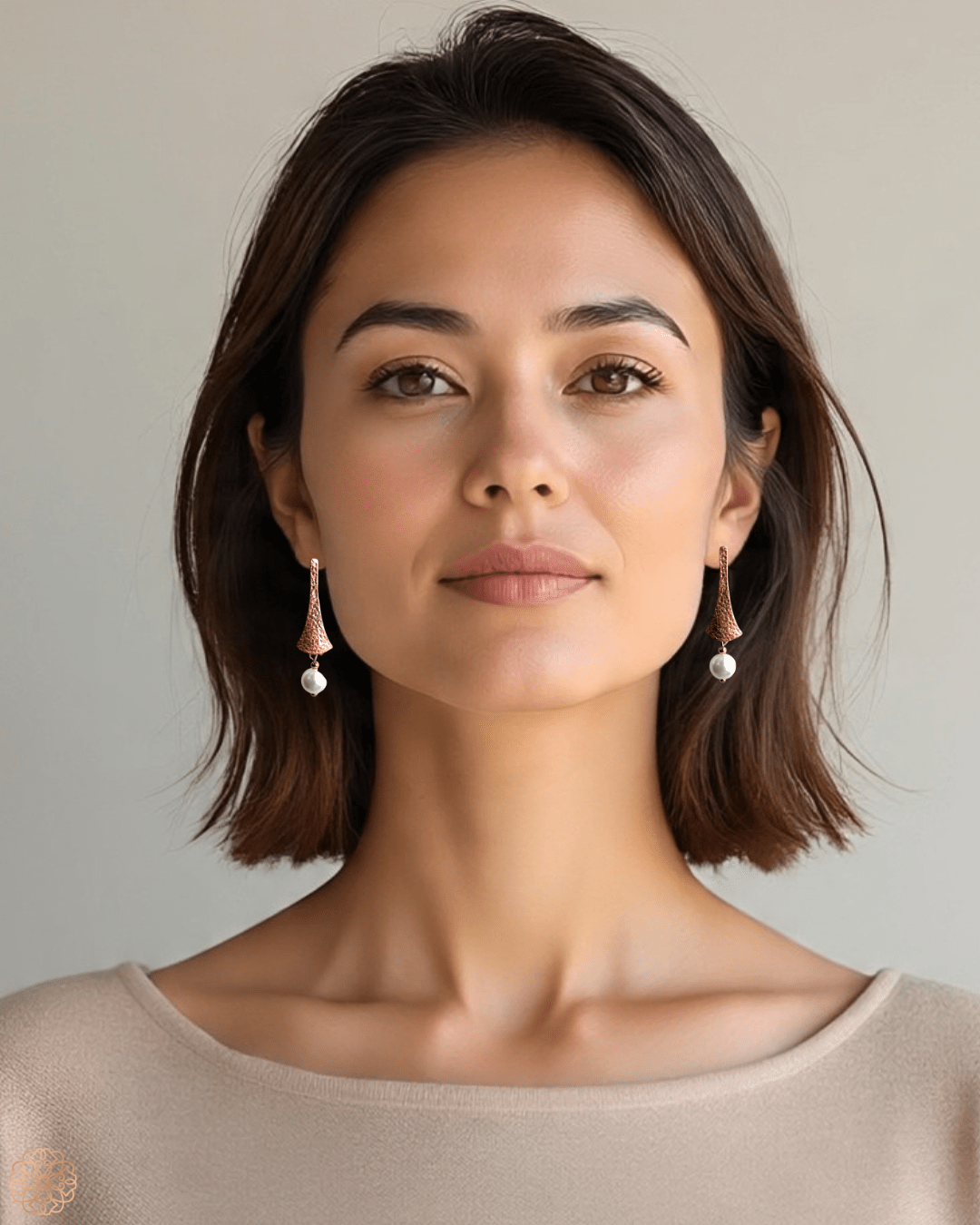 These simple copper drop earrings with pearl in a modern design will quickly become your wardrobe's versatile hero. Triangular shaped copper with a textured surface that hangs from the ear lobe and a pearl is suspended.