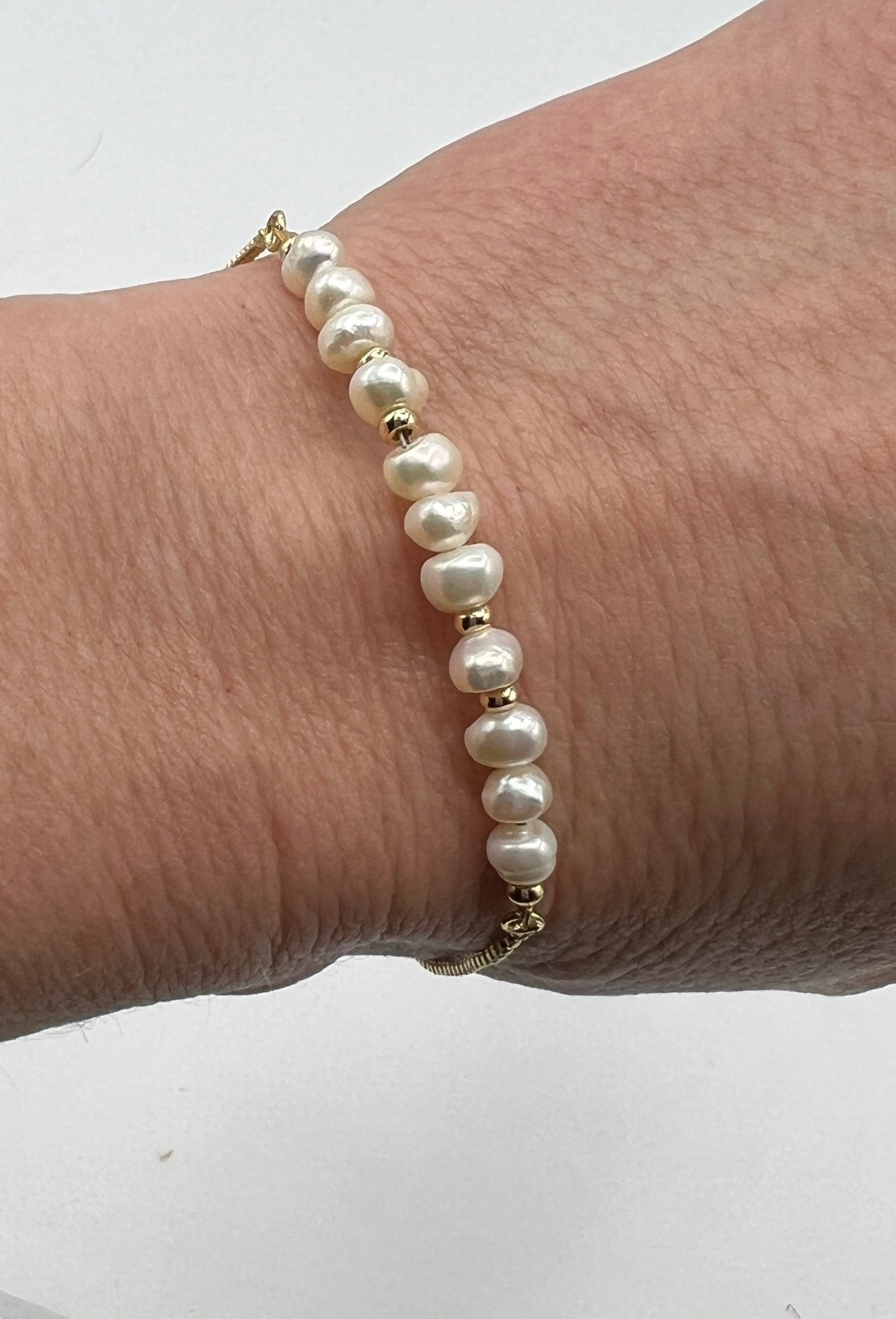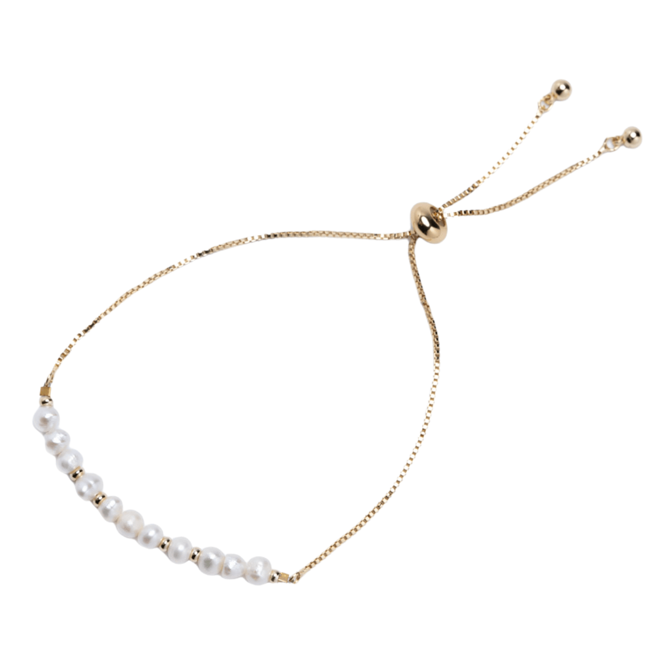A single strand of lustrous freshwater pearls sits beautifully across the top of the wrist, their natural sheen adding just the right touch of classic elegance. Slim chainlink sides in warm brass create an airy, modern balance, while a secure clasp allows for an adjustable, personalized fit that ensures comfort all day long.