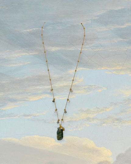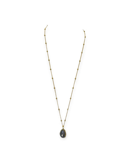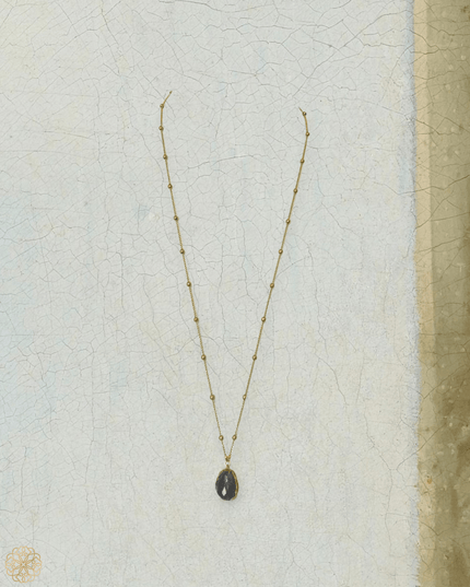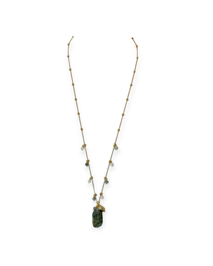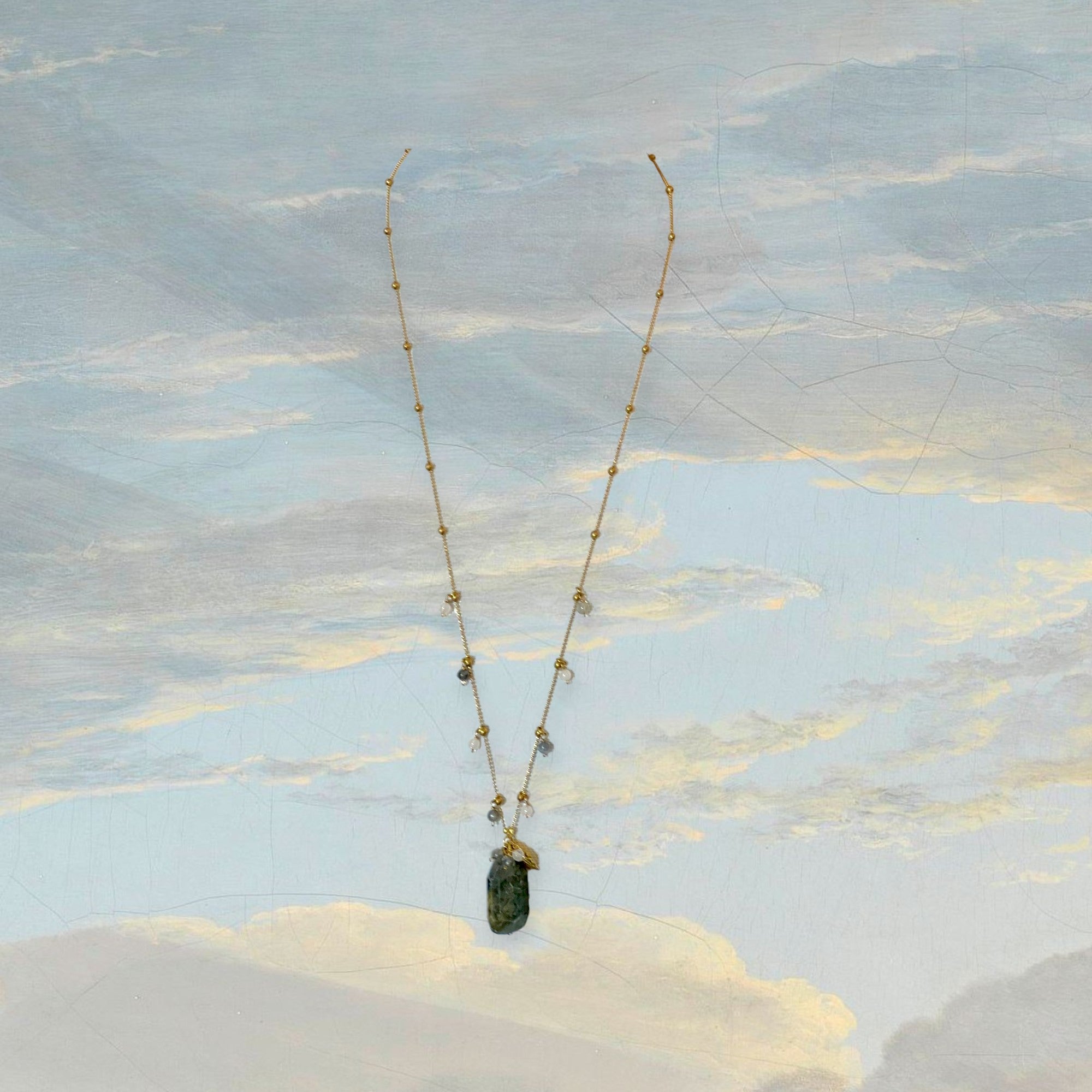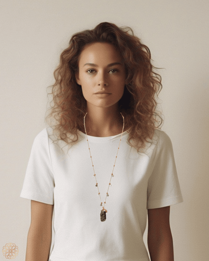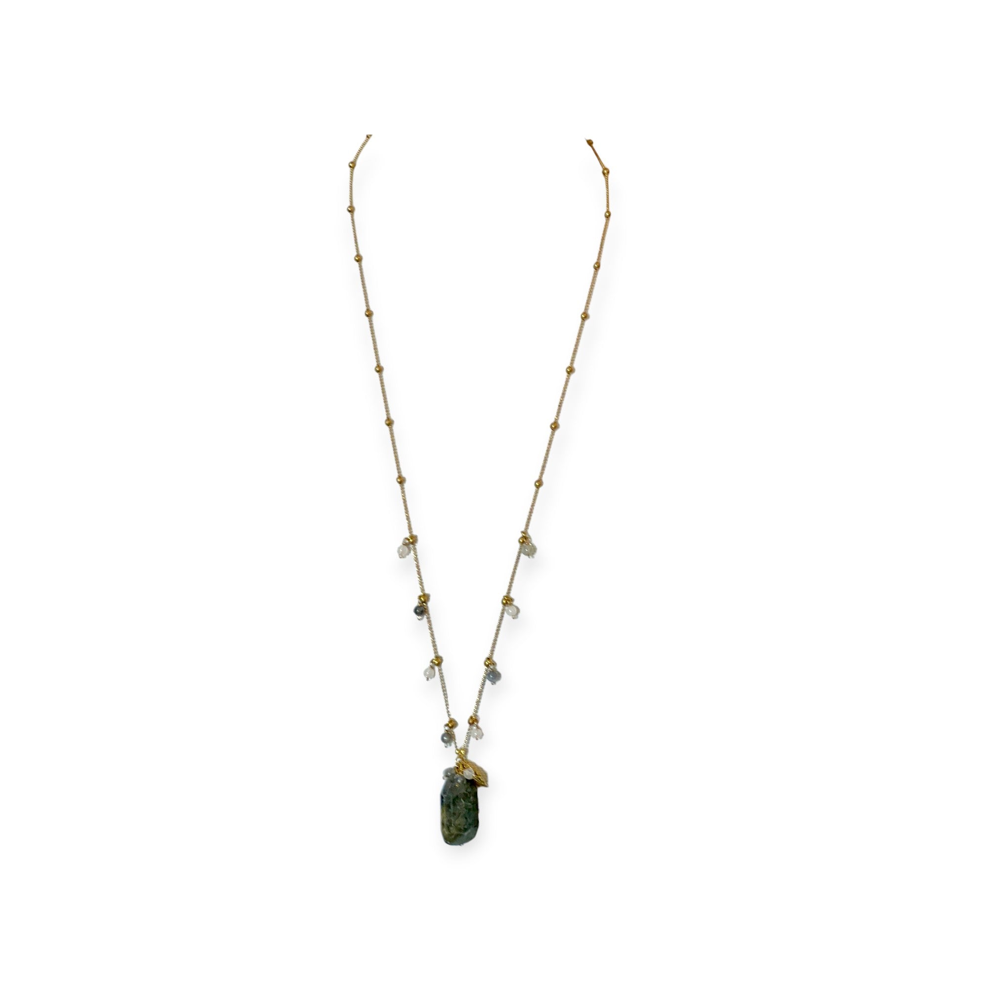 Labradorite: A more elaborate design with soft flashes of grey and blue. Accented with quartz and labradorite beads along the chain, and finished with a beautifully detailed brass leaf charm near the pendant—adding texture, movement, and a touch of the unexpected.