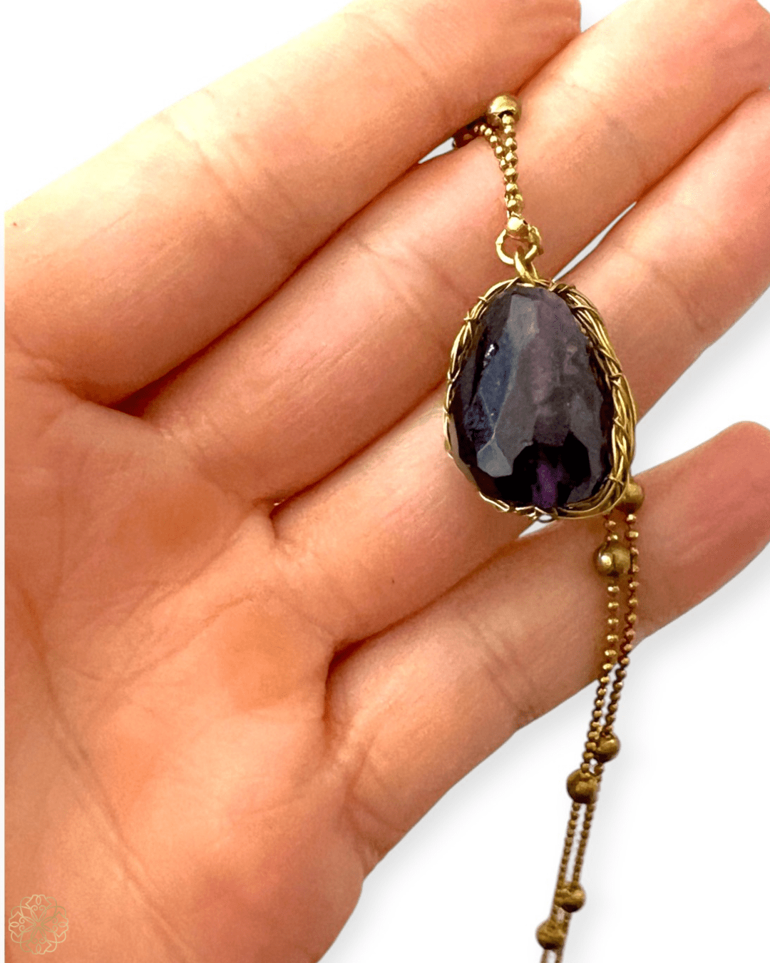 Amethyst: A rich, regal purple glow set against a chain adorned with bold brass beads for an elegant yet earthy aesthetic. This version is perfect for those who love color with depth and a touch of grounding warmth.