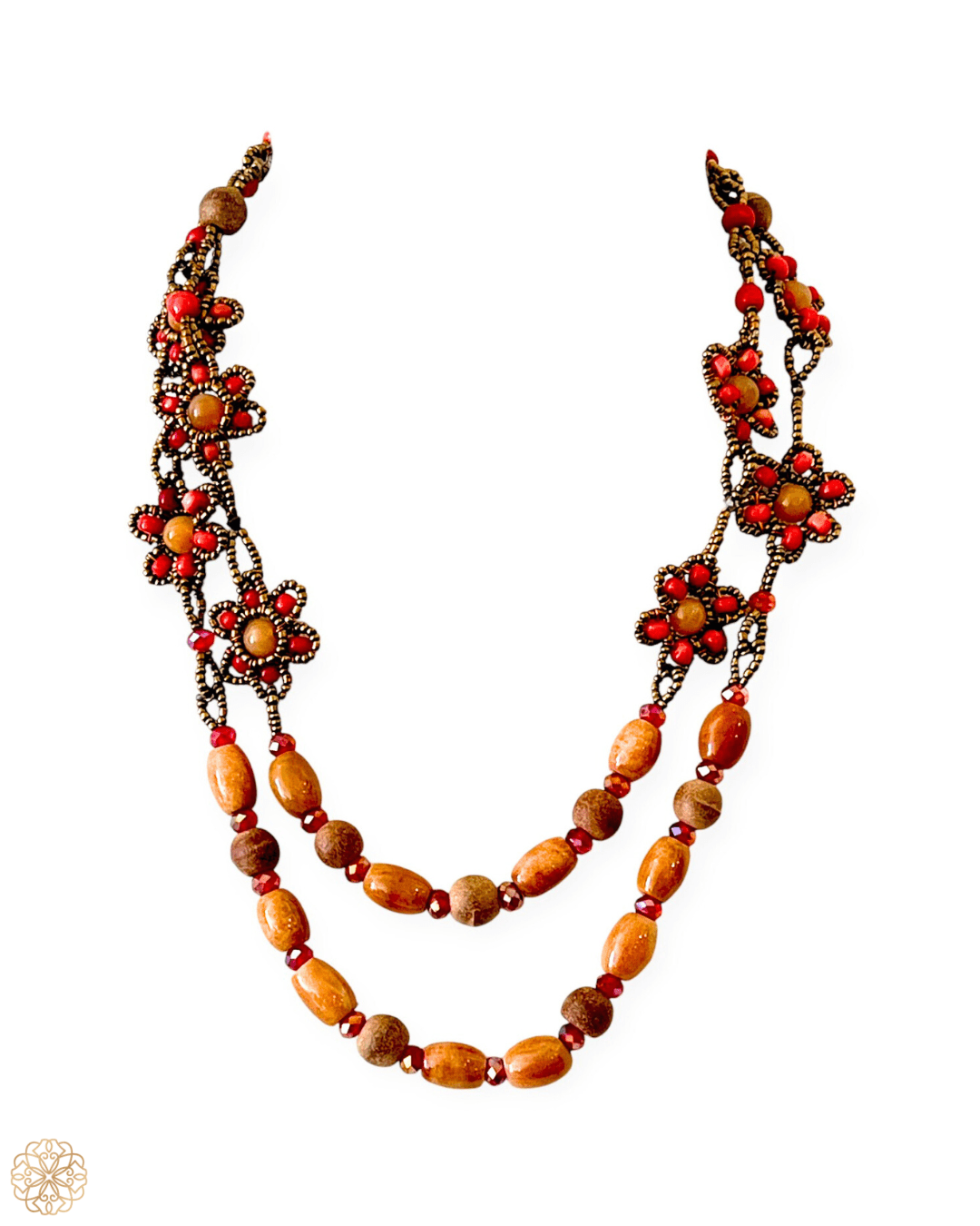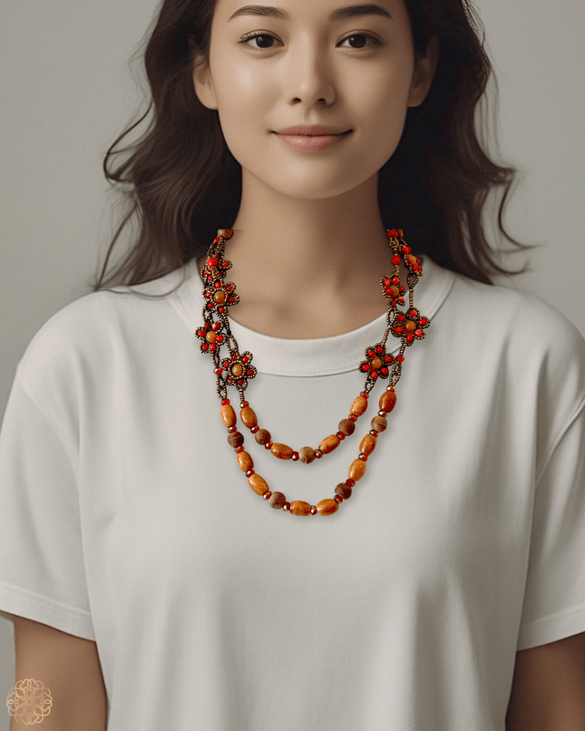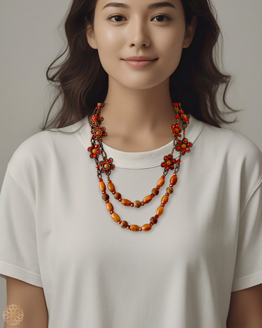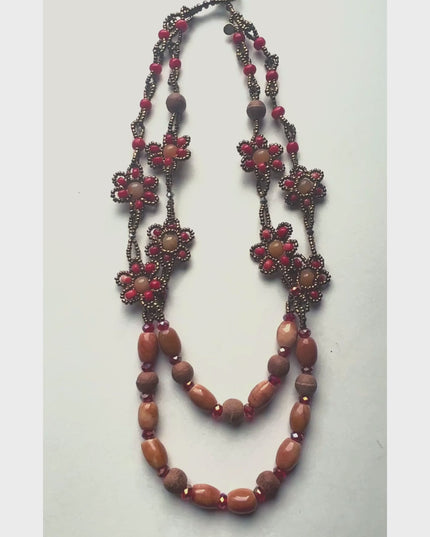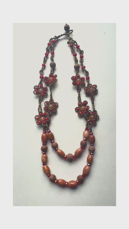 Sunset Mookaite & Wood Double Strand Necklace – Floral Warmth, Artisan Craft