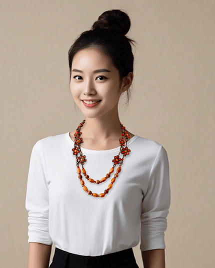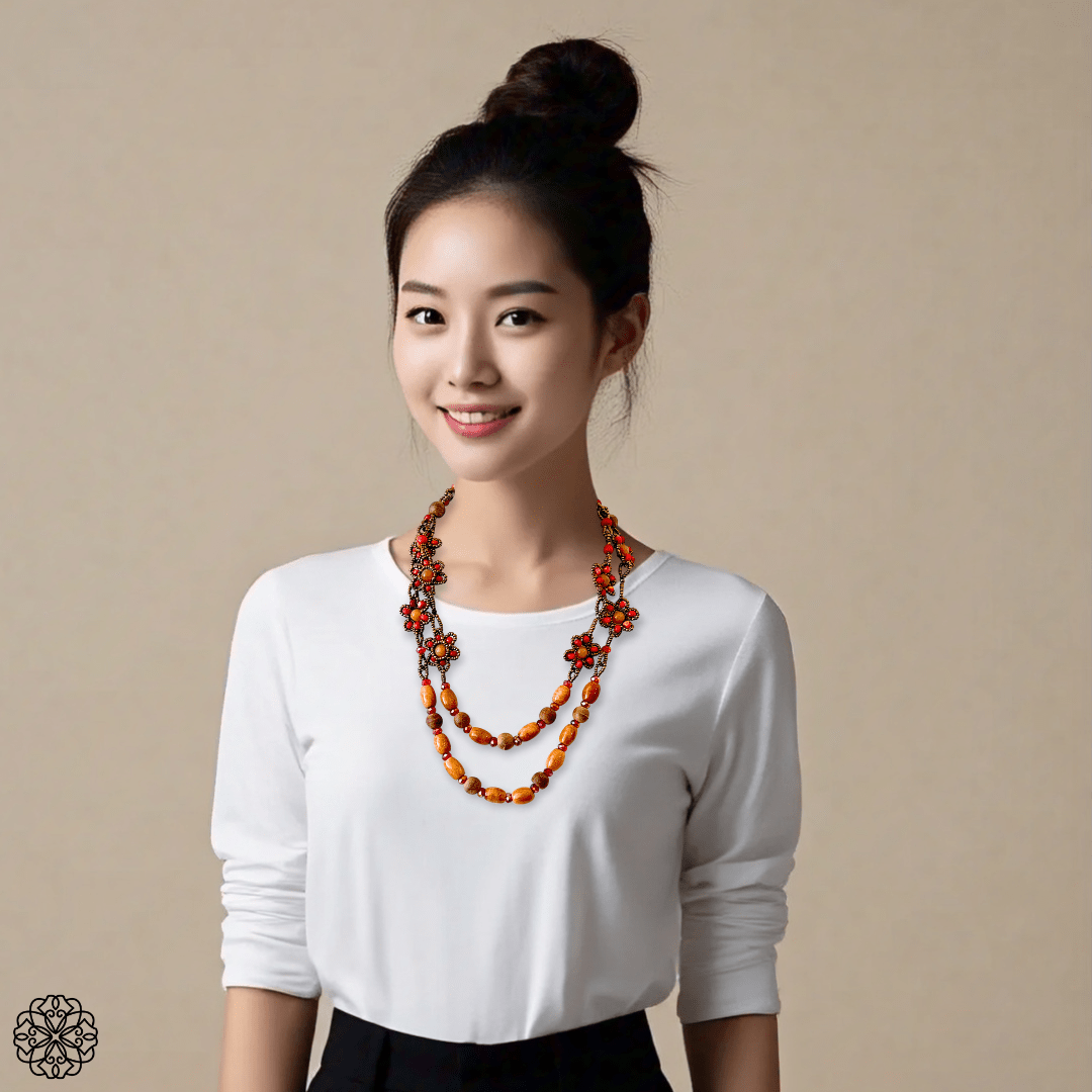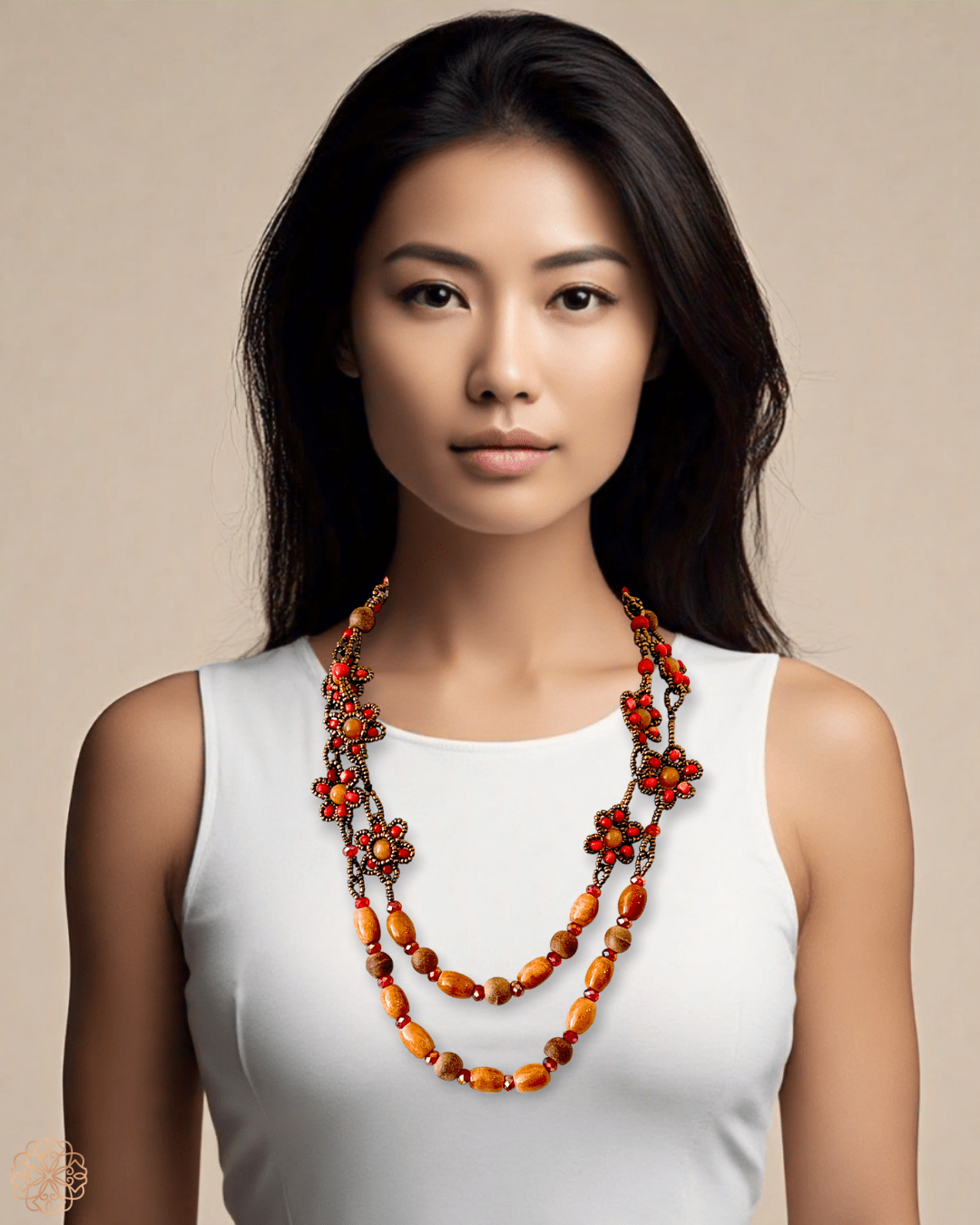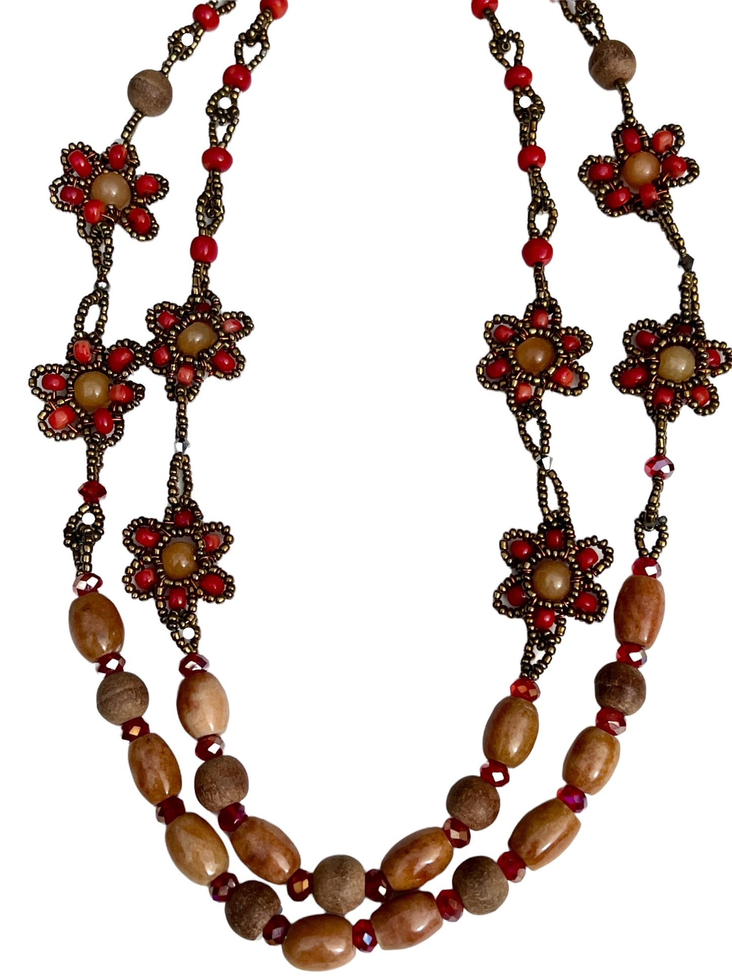 Sunset Mookaite & Wood Double Strand Necklace – Floral Warmth, Artisan Craft