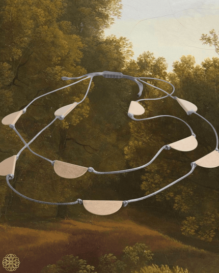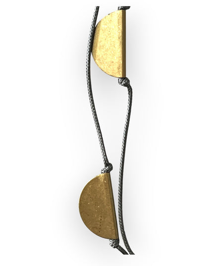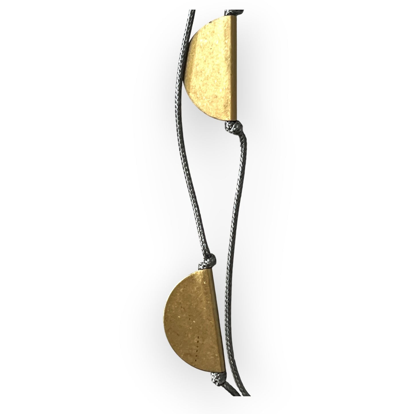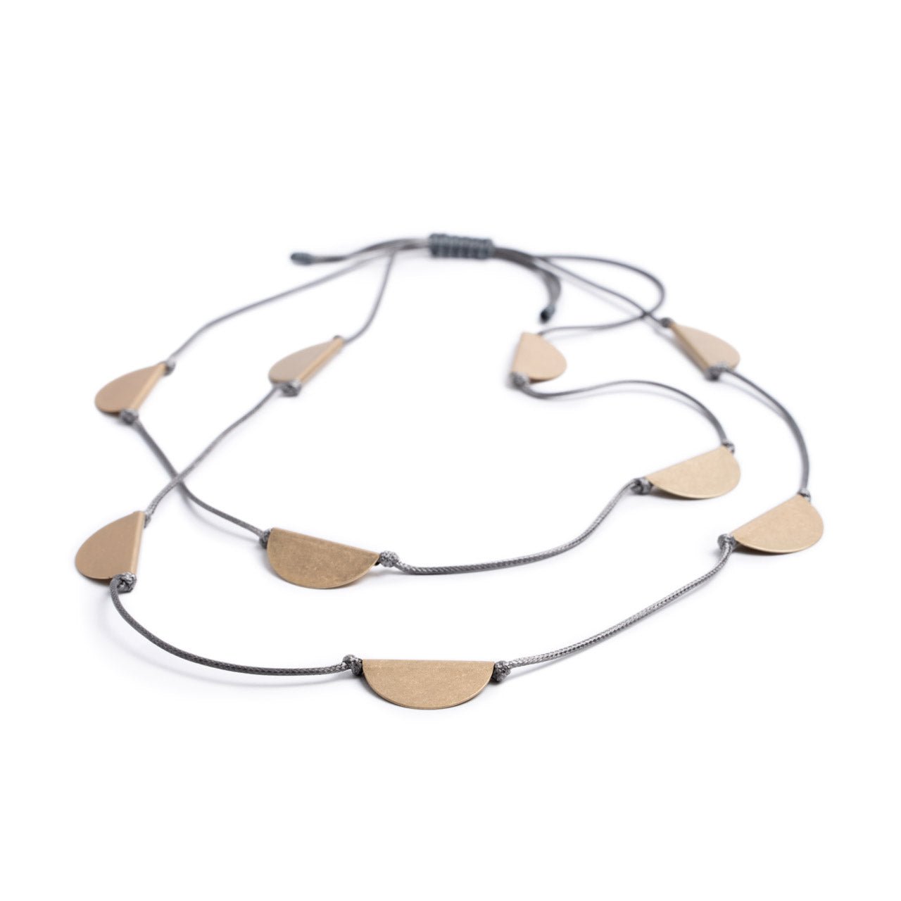 Clean lines meet contemporary style in this double-strand necklace, crafted with soft grey cord and accented by brushed brass semi-circles. The mix of fabric and metal creates a balanced contrast—casual enough for everyday wear yet elevated enough for evening polish.