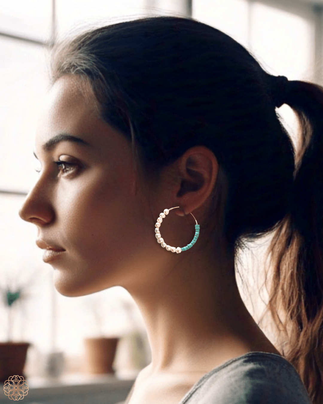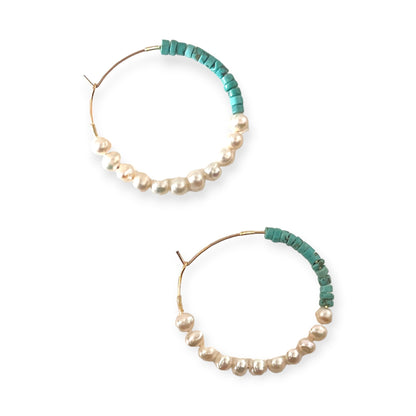 Drop hoop turquoise and pearl earrings