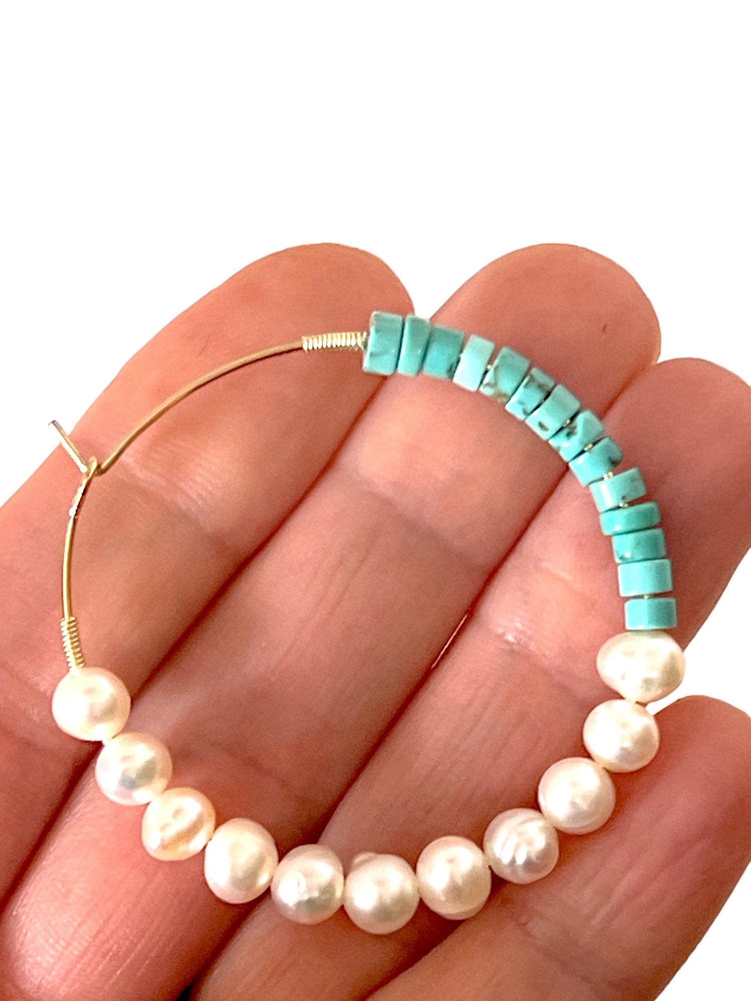 Handmade drop hoop turquoise and pearl earrings consist of fresh water pearls and turquoise just for your ears. This artisan creatively combines these two gemstones in one setting, making them a special pair of dangling pearl and turquoise earrings. The hoop consists of pearls on one half of the hoop and for good measure turquoise beads round out the other half to make it a colorful addition to any outfit.