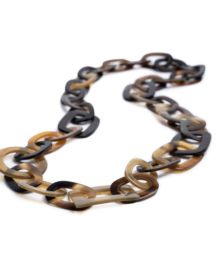 The varied link design adds texture and visual interest, while the warm natural tones make it easy to pair with virtually any outfit—from tailored turtlenecks to casual tees. Thoughtfully handcrafted from sustainable horn, each necklace is one-of-a-kind due to the organic variation in color and pattern.