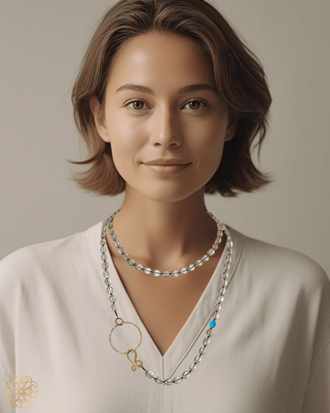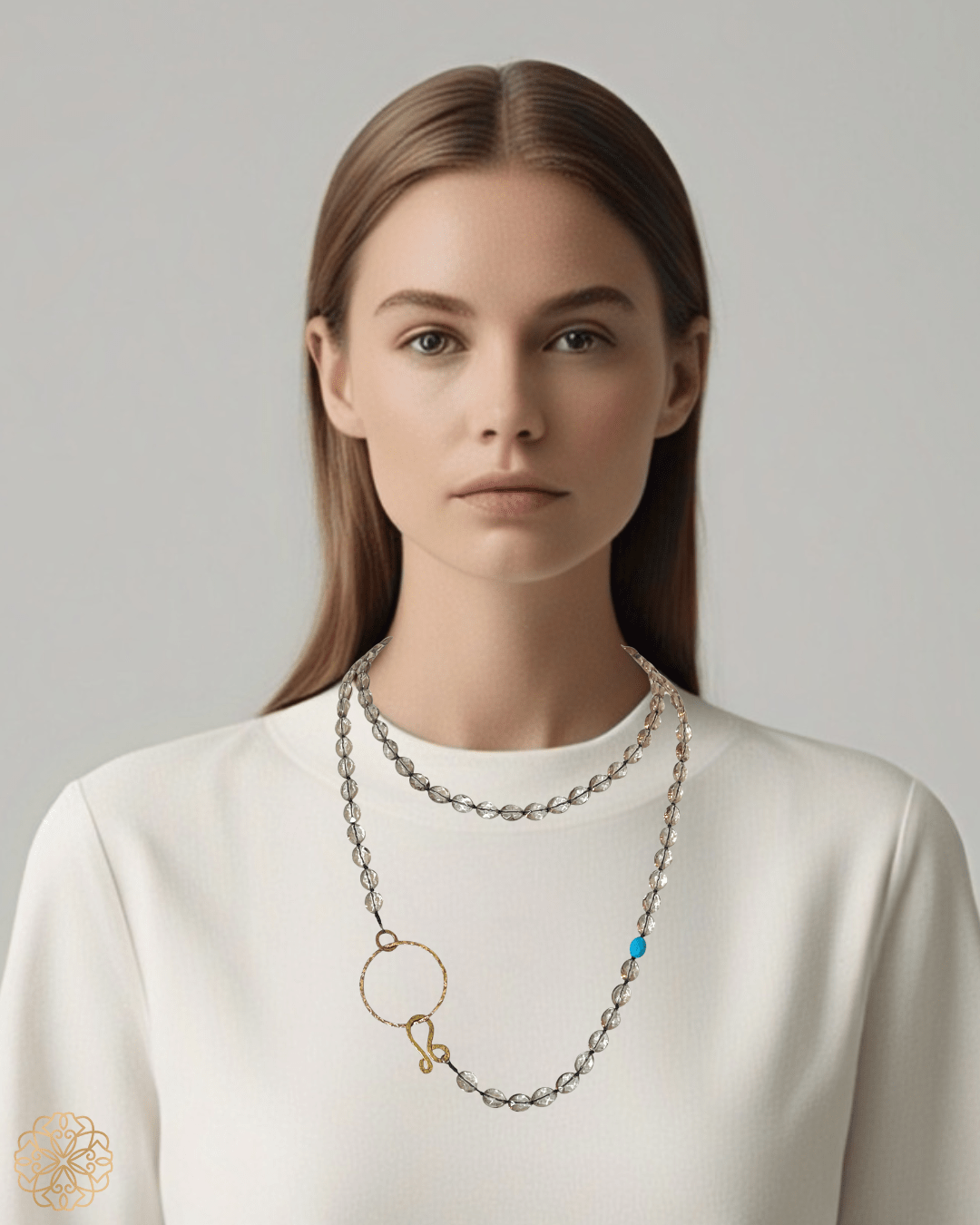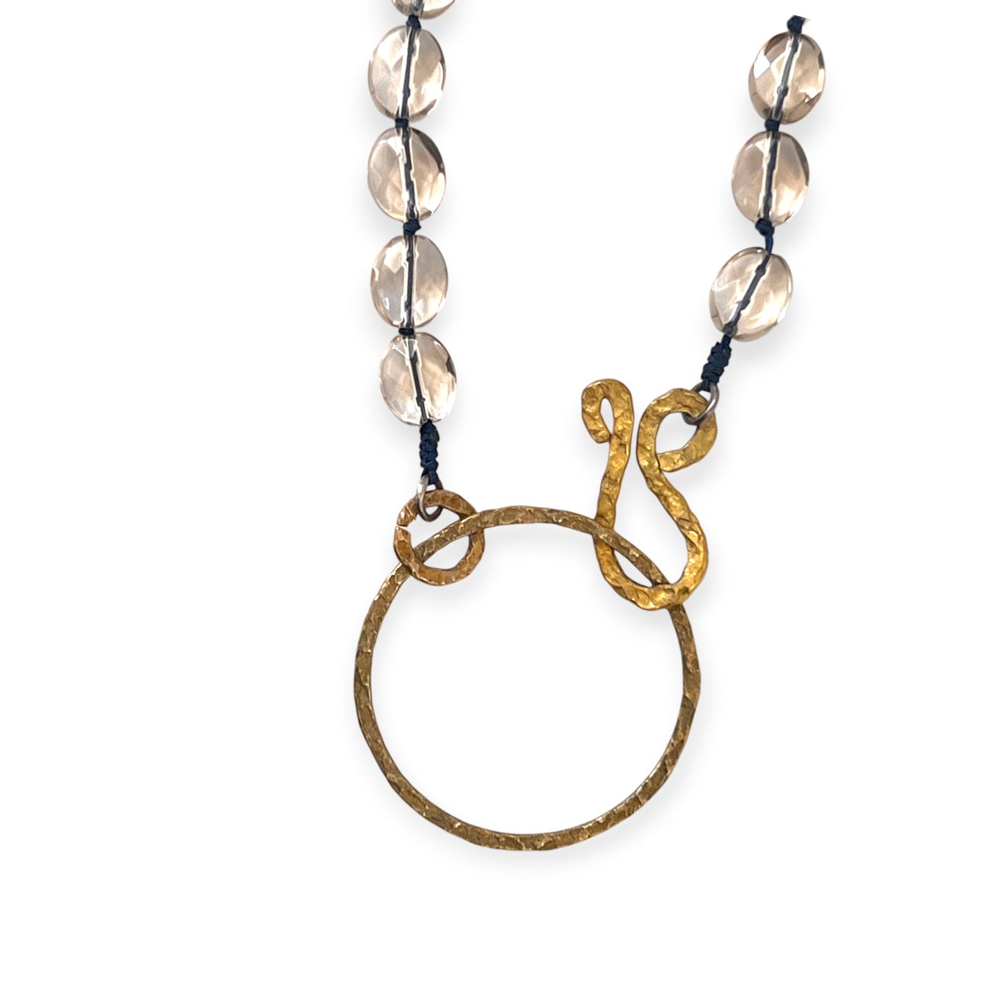 This special, handmade necklace is sure to become a fast favorite. We appreciated the attention to detail such as the dark thread running through the beads to contrast with the quartz. The jewelry designer made only one necklace with this gemstone [smoky quartz].