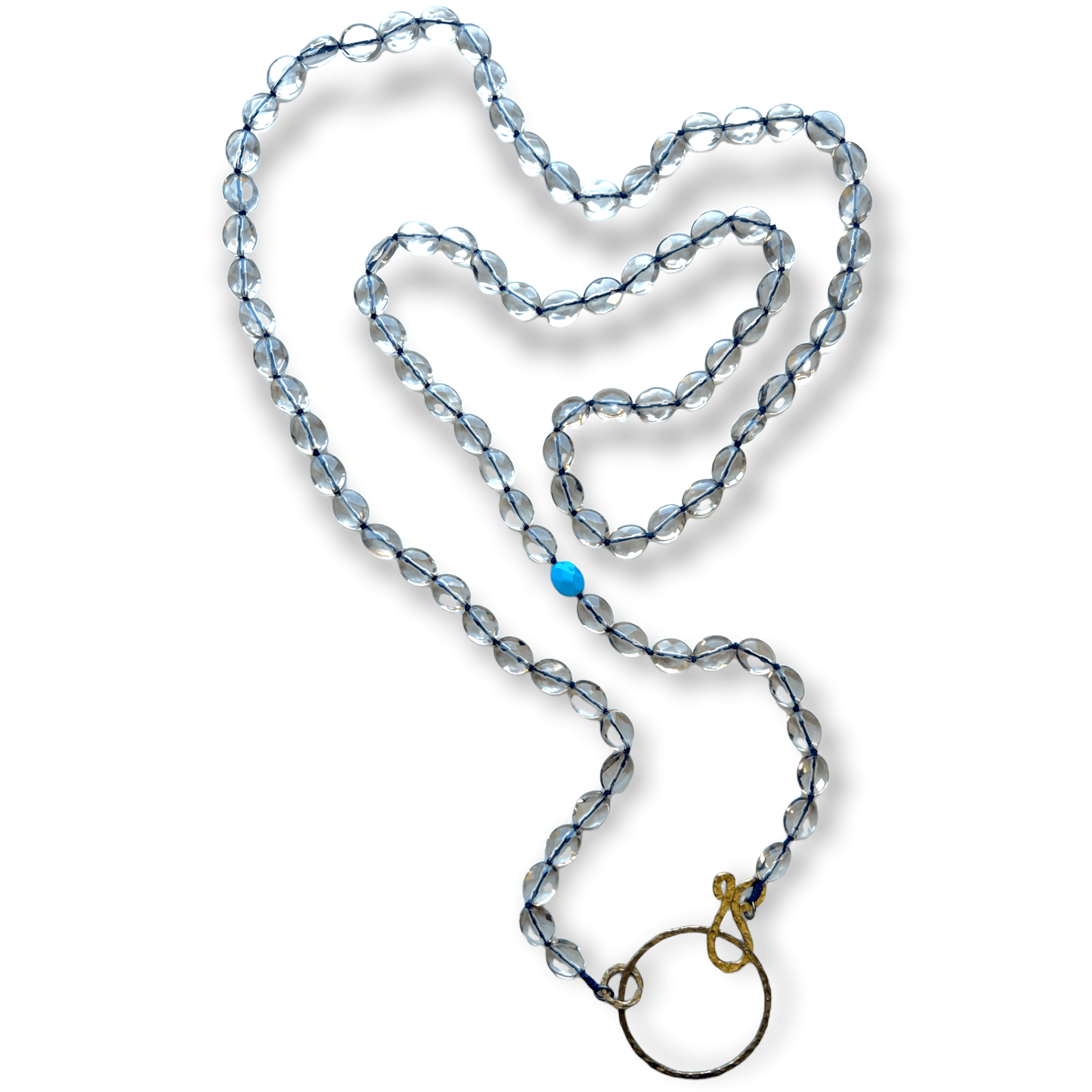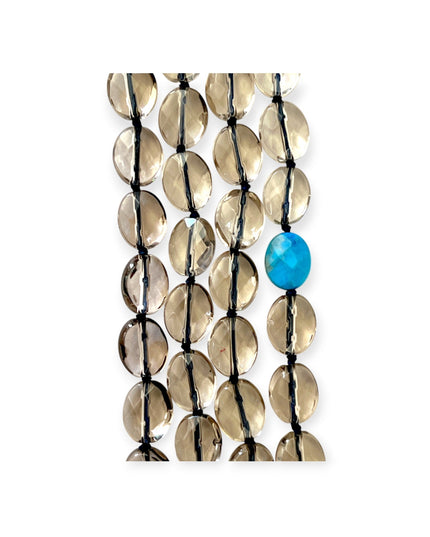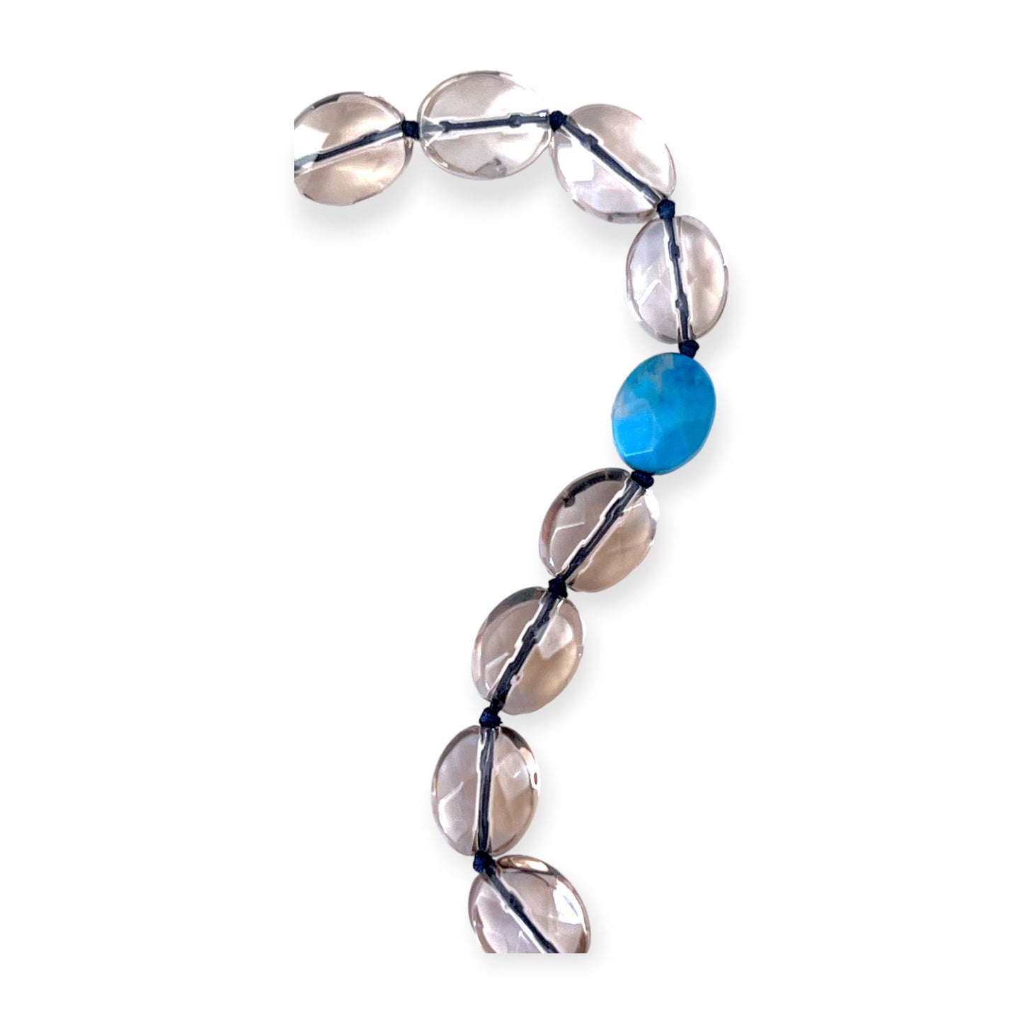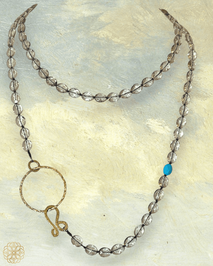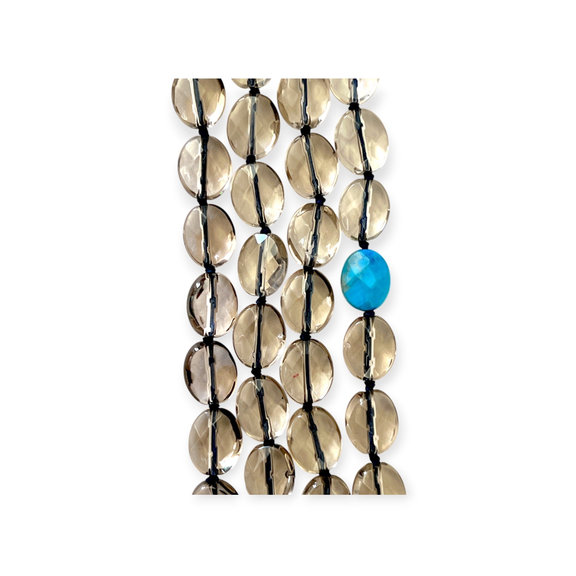 A versatile faceted oval smoky quartz beaded statement necklace made primarily of smoky quartz beads with a turquoise bead for a pop of color and hand crafted brass accents artfully incorporated. The addition of a single turquoise stone draws the eye as does the brass accents added to create a unique look with the beading. This one-of-a-kind necklace is for a woman that deserves something special and unique.