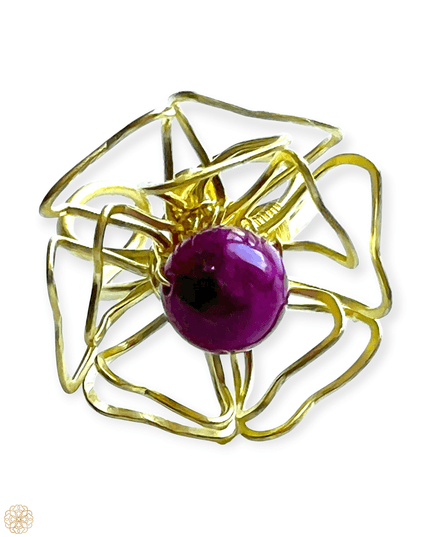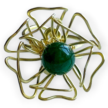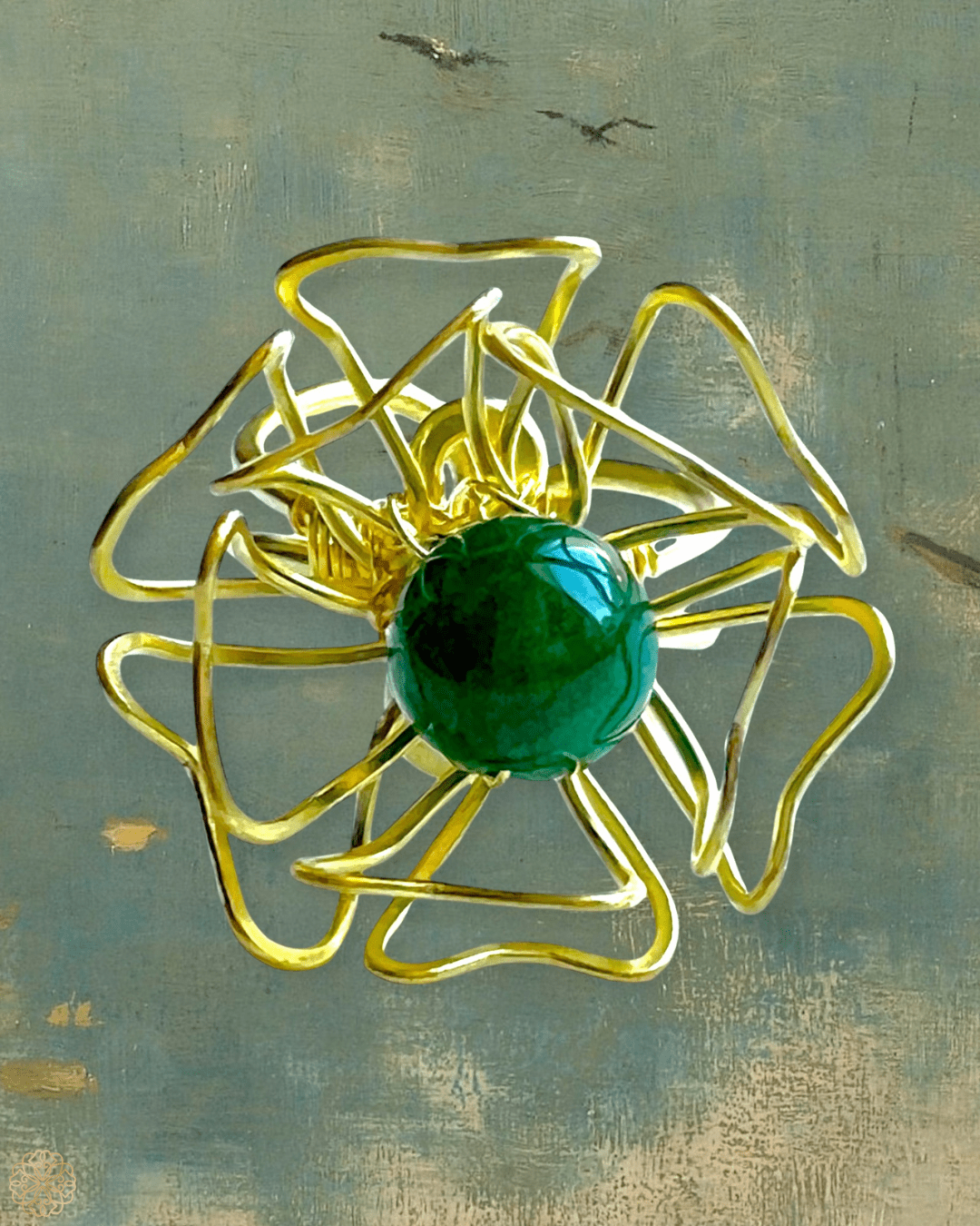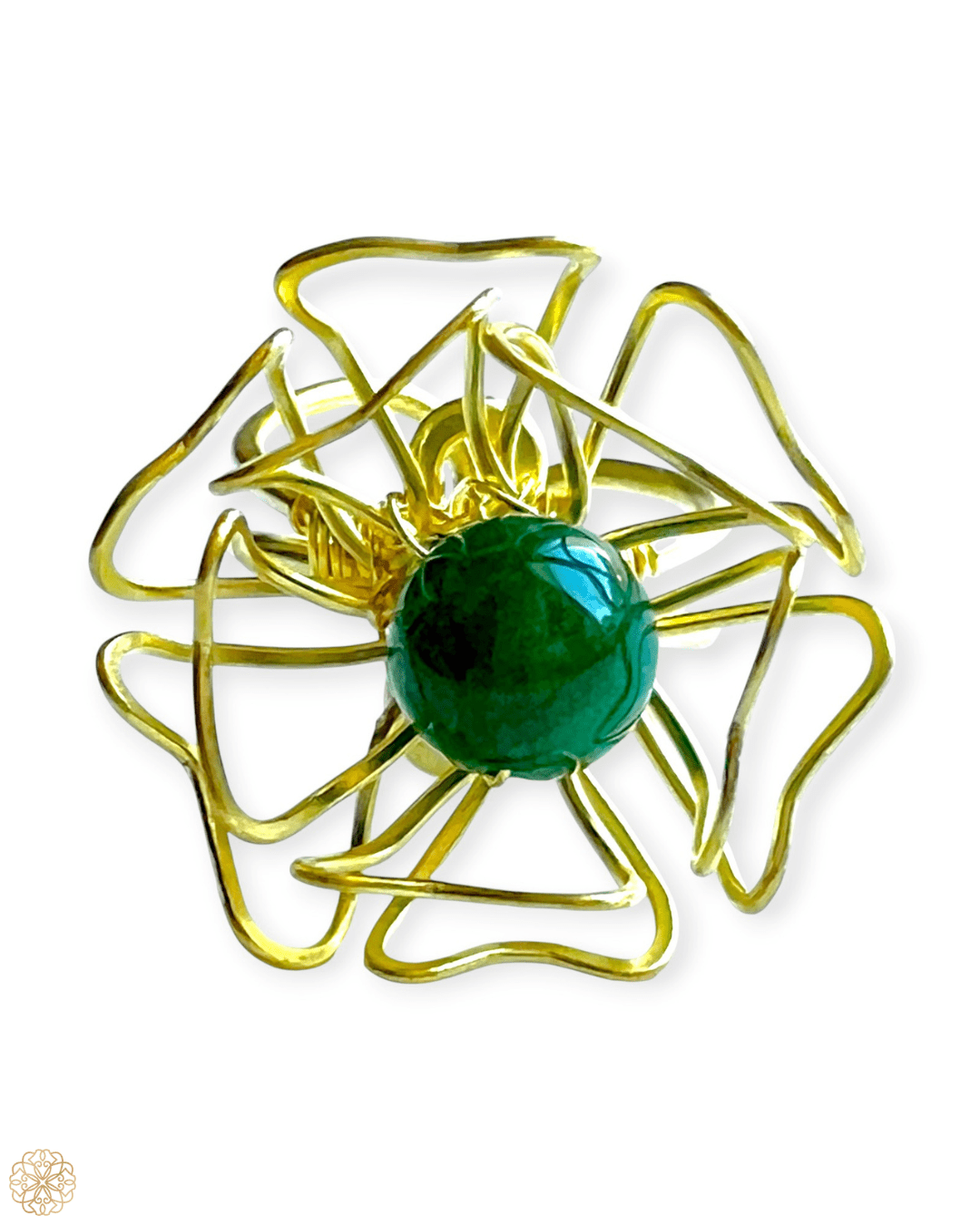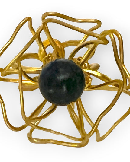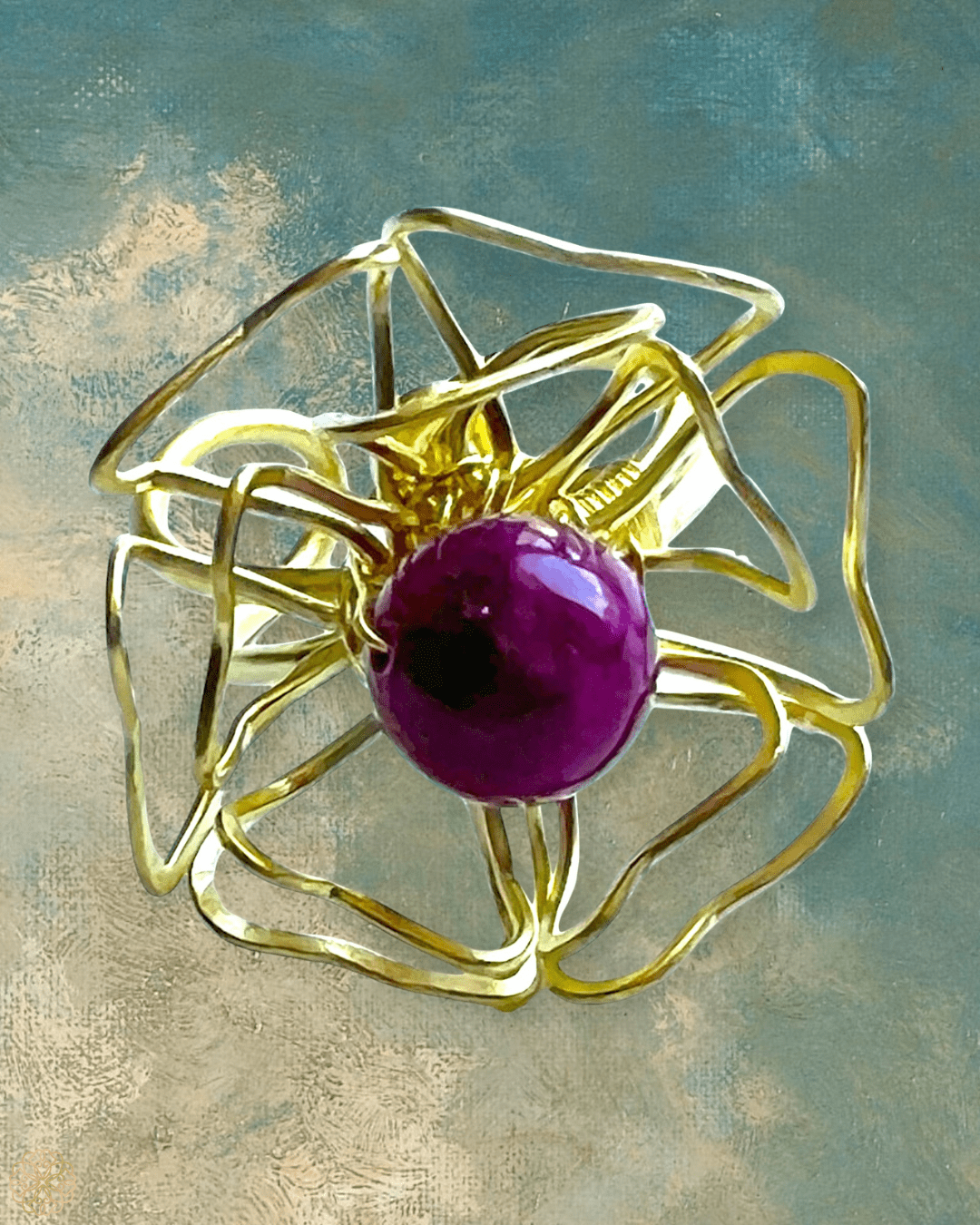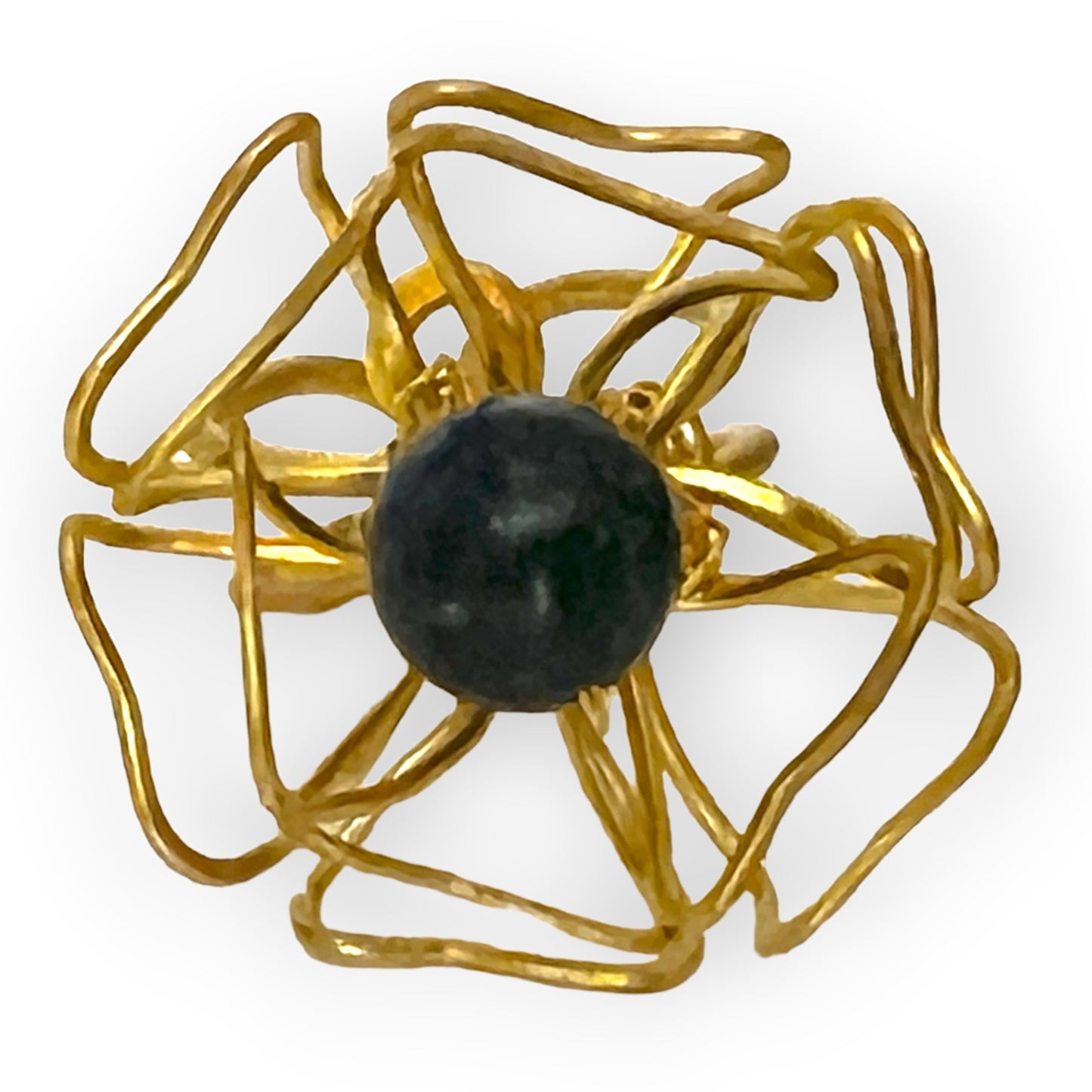 Delicate yet bold, this airy floral-inspired statement ring brings the perfect pop of color to your fingertips. Crafted by a skilled artisan with a flair for the unique, each ring showcases a beautifully woven flower motif, centered with a vibrant gemstone sphere. Whether it's the lush green of chalcedony, the deep blue of azurite, or the warm earthiness of agate — each stone adds its own personality to the design.