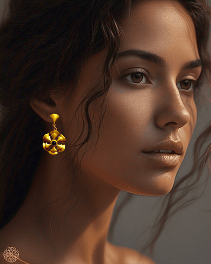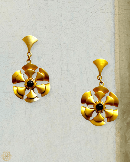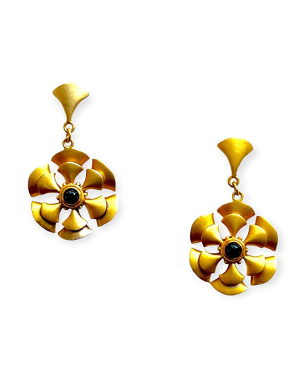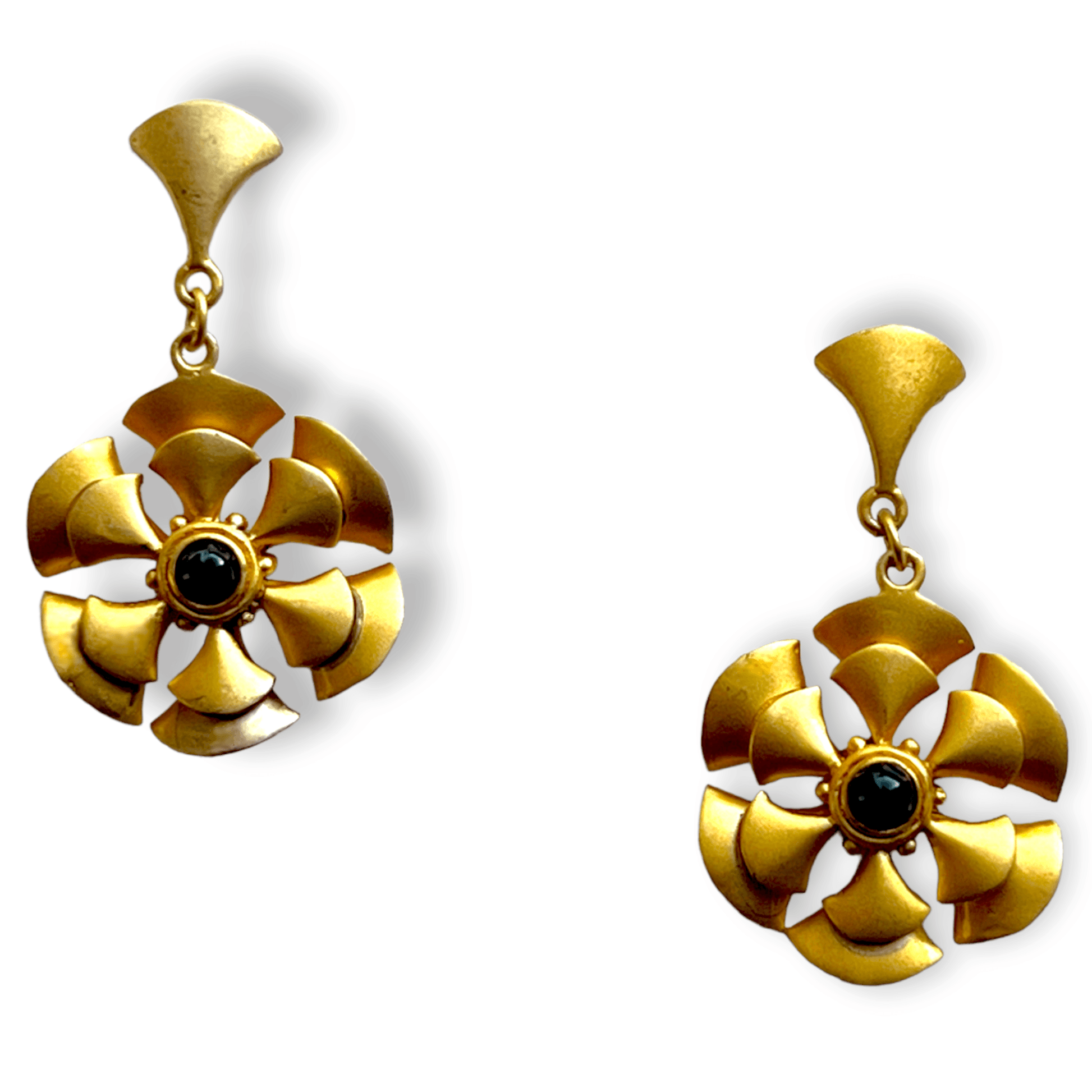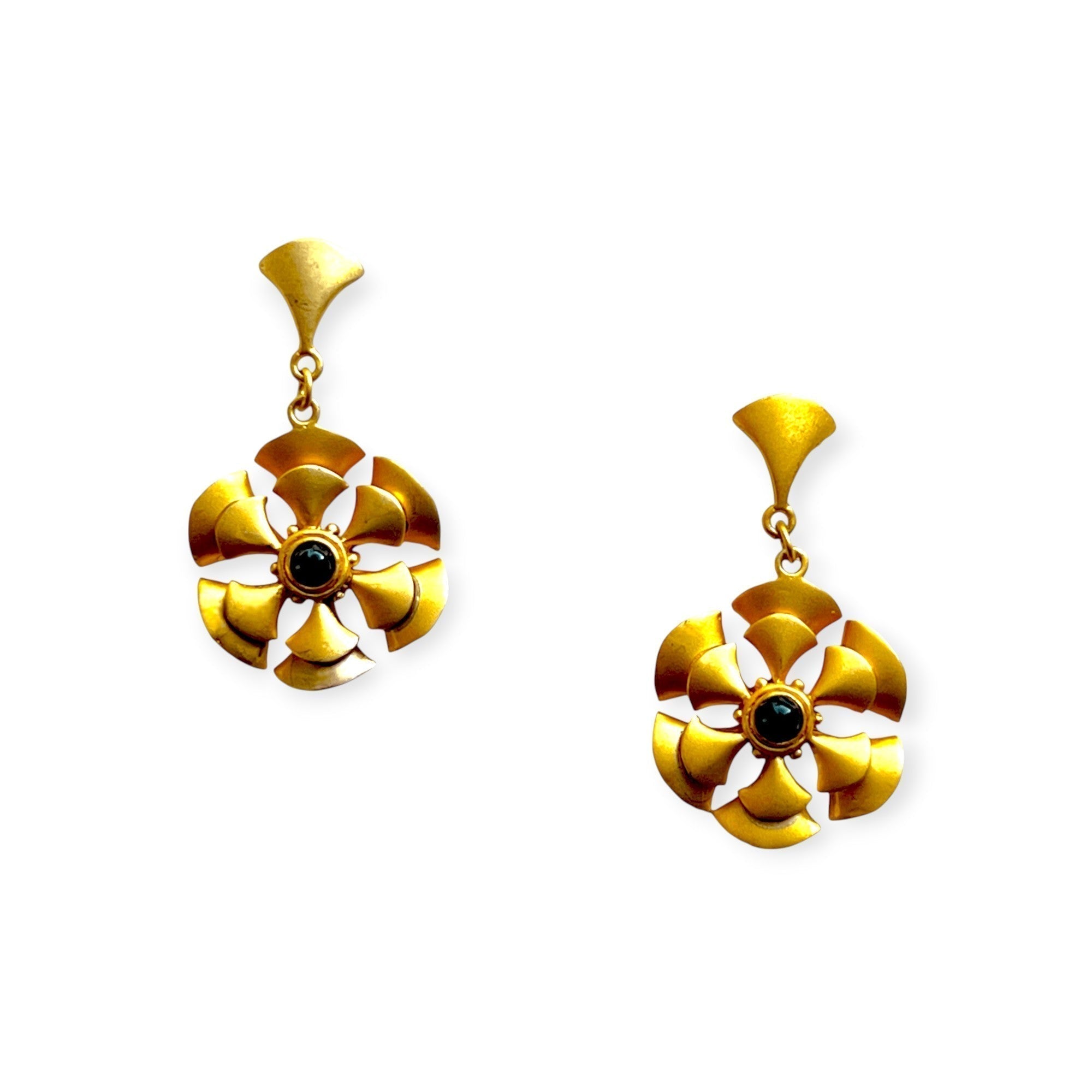 These one-of-a-kind floral onyx drop earrings reinterpret the flower motif with abstract sophistication. Suspended from a minimalist inverted triangle, a modern, stylized bloom unfolds beneath—its center accented by a polished black onyx bead that brings depth, contrast, and just a hint of mystery.