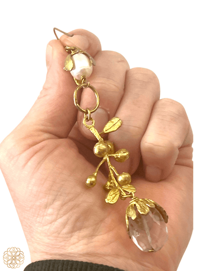 Shorter Earring (~4" drop): Begins with a pearl “bud” at the ear, cascades through brass floral filigree, and ends in a larger bud cradling a faceted quartz stone.