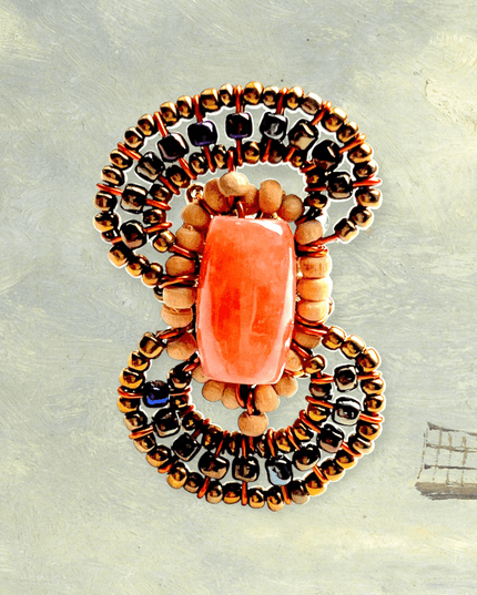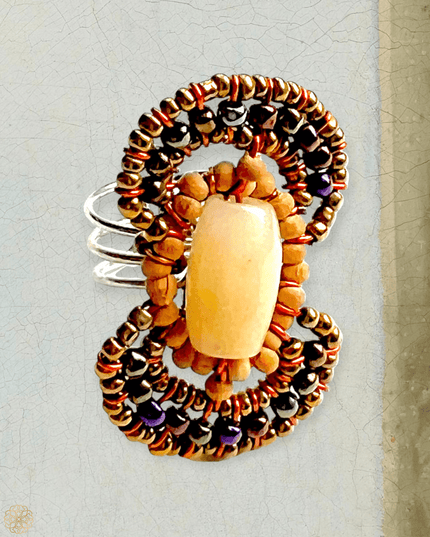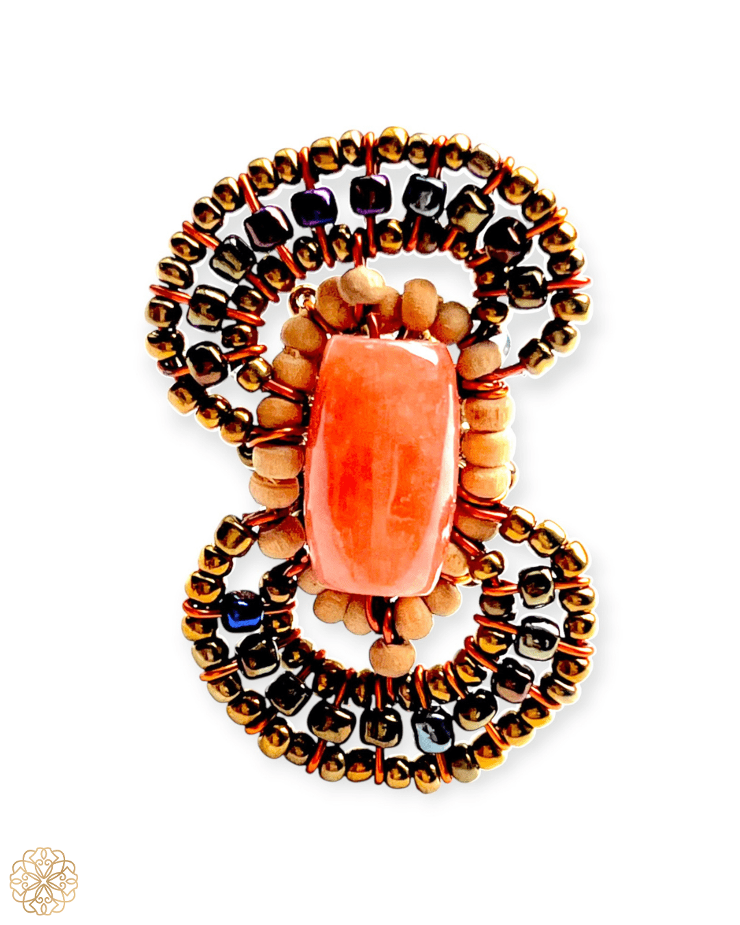This Figure 8 Statement Ring places the gemstone front and center, turning nature’s artistry into bold design. Framed by tiny seed beads and warm wooden accents, the composition draws the eye and catches the light—creating a rich, dimensional effect that seems to shift depending on what you wear.