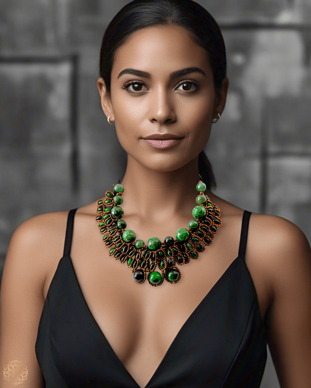 Each stone carries its own story: jade, with its grounding calm, and ruby zoisite, alive with variegated greens and flashes of ruby red. Together, they create a palette that is bold yet balanced, vivid yet serene — a reflection of nature’s artistry and human craftsmanship.