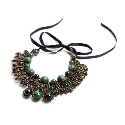 Ruby zoisite (anyolite), jade, jadeite, seed beads, satin ribbon
