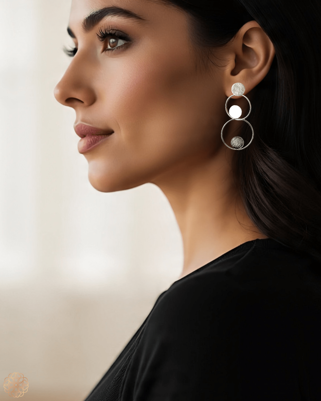 Handcrafted by a gifted jewelry artist who works exclusively in sterling silver, these modern drop earrings embody the perfect balance of elegance and motion. What appears simple at first glance reveals a carefully constructed design: interlocking polished silver circles suspended from a brushed silver disc, each element catching the light in its own unique way.