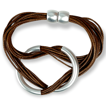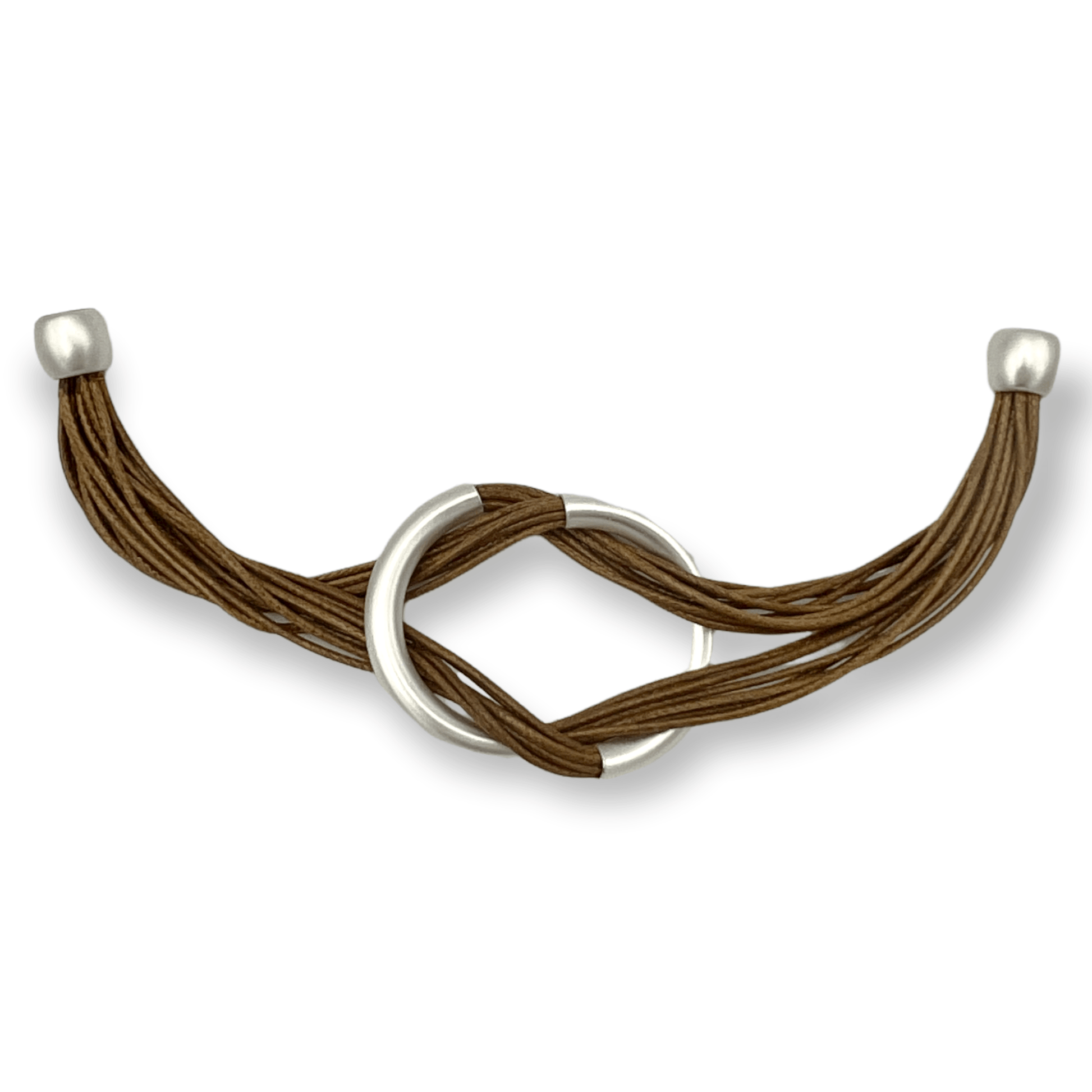 This interlocking knotted bracelet with clasp looks just as good solo on your wrist as befriended by some of your other favorites. With an interlocking woven design consisting of dark brown leather straps and a silver plated brass details, it adds interest to your wrist. It has a modern feel with the metal hardware with a sense of tribal thrown in making it a wonderfully versatile bracelet.