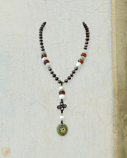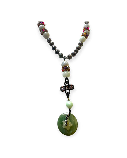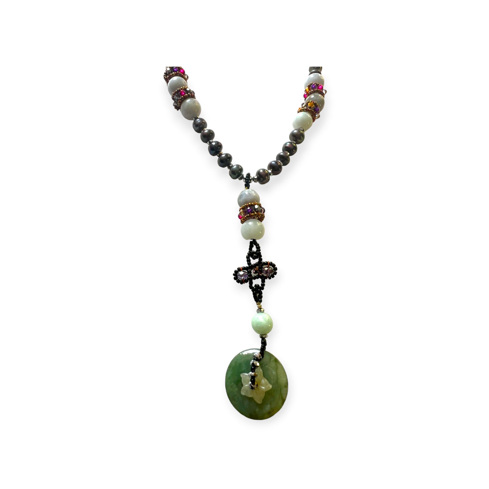• Handcrafted jade and pearl beaded statement necklace with jadeite medallion
