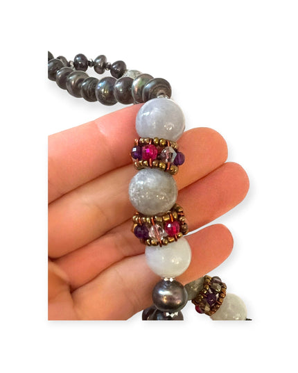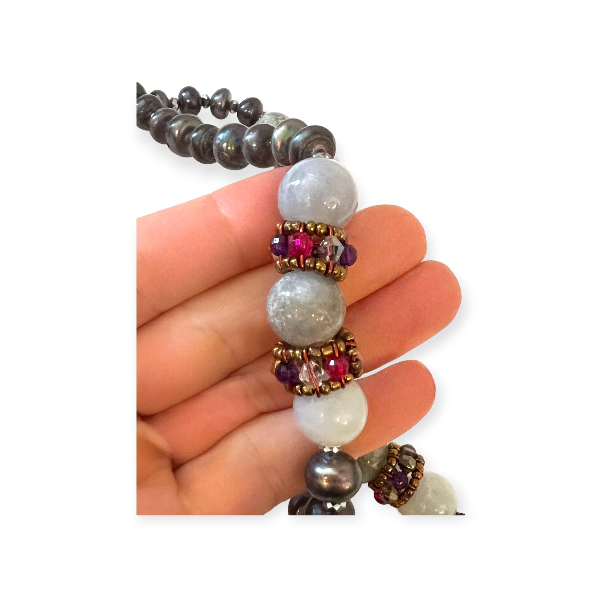 This necklace is a study in balance — the luminous glow of pearls paired with the serene beauty of jade. Handcrafted by a husband-and-wife artisan duo celebrated for their inventive gemstone pairings, it transforms timeless materials into a striking work of wearable art.