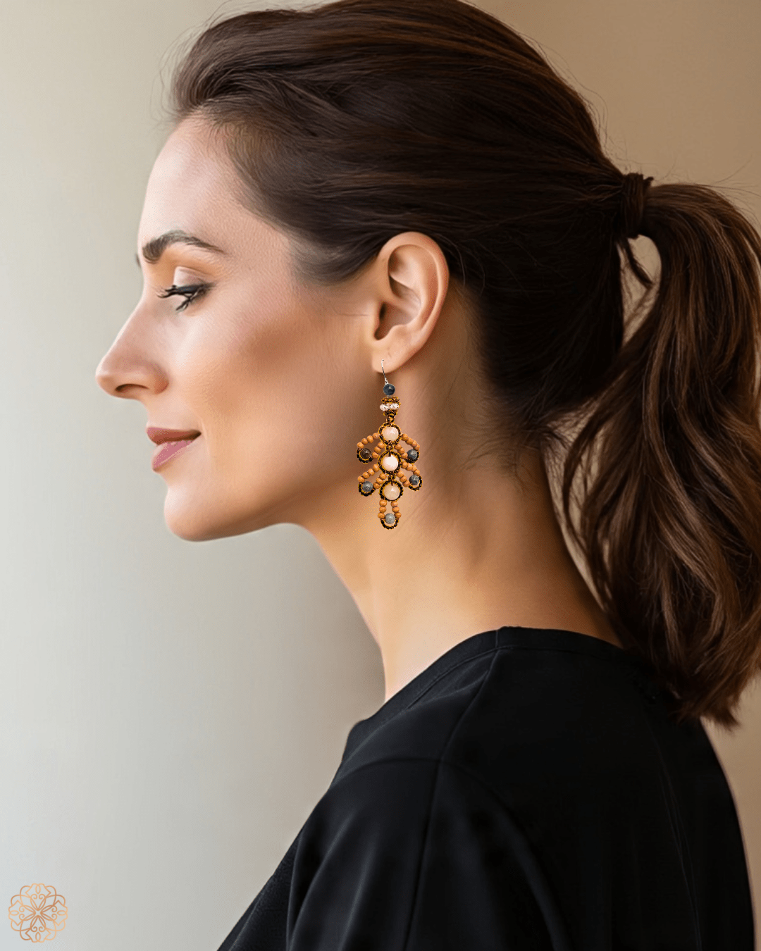 Design: Handcrafted leafy earrings in a layered gemstone motif