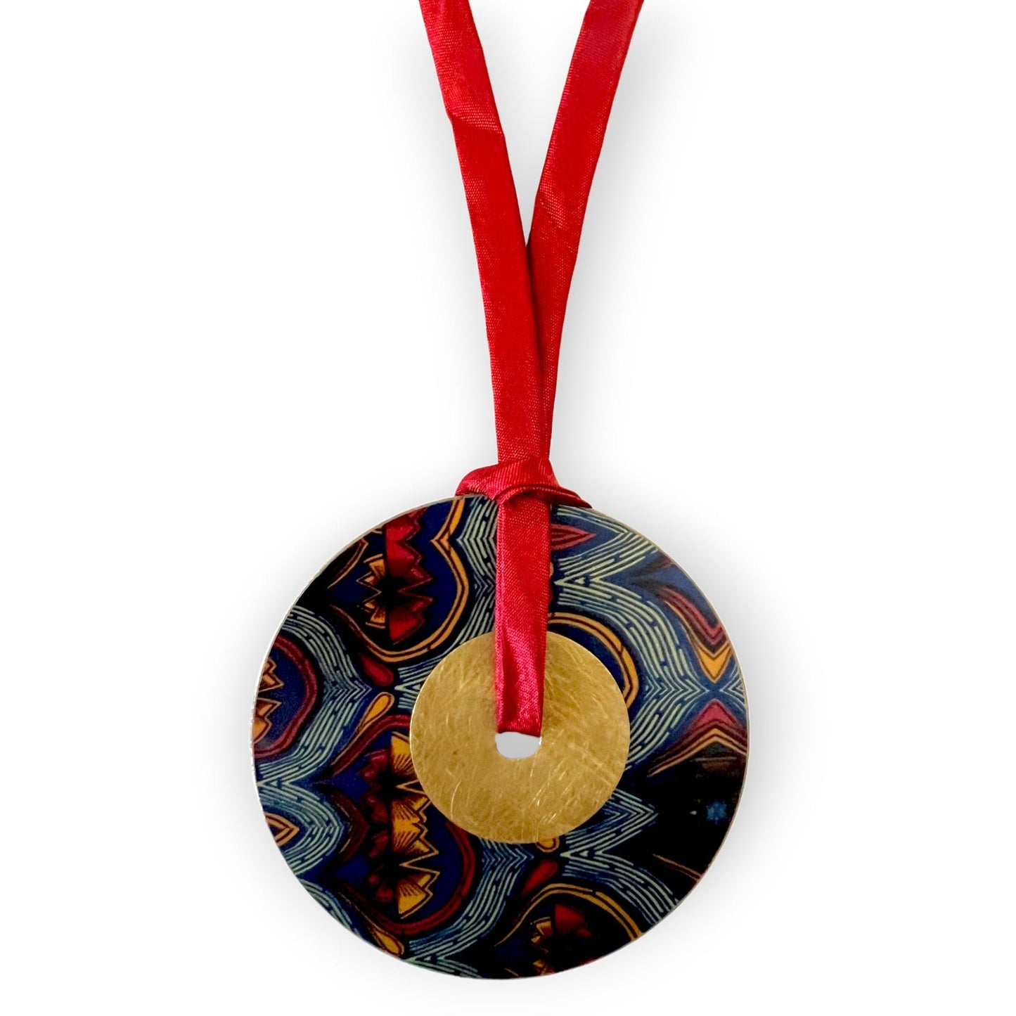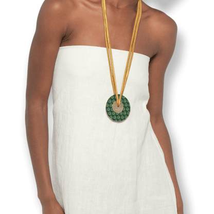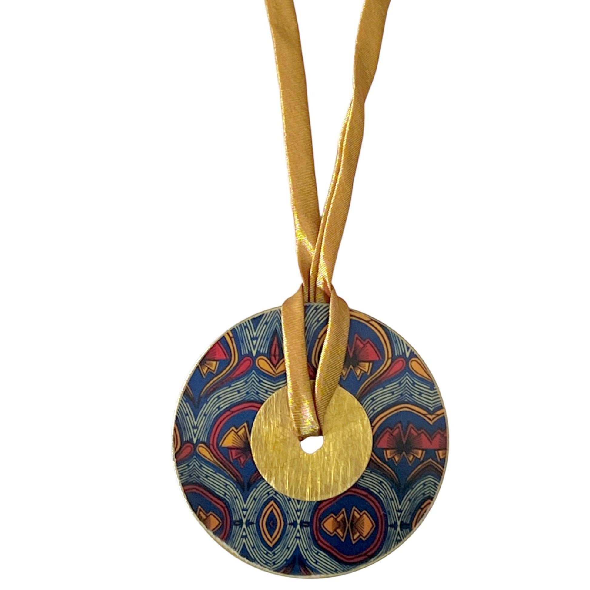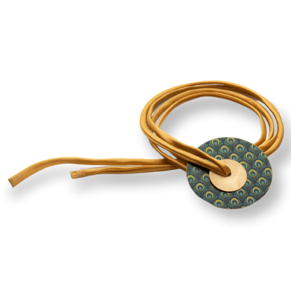 We love options—and this wanderlust-inducing statement piece delivers on all fronts. Designed to be worn as either a bold necklace or a chic belt, this handcrafted accessory offers ultimate versatility. Suspended from a soft satin cord, the large brass disk features a travel-inspired, fabric-patterned design on both sides—each side with a complementary motif from the same region, offering a reversible look to match your mood or outfit.