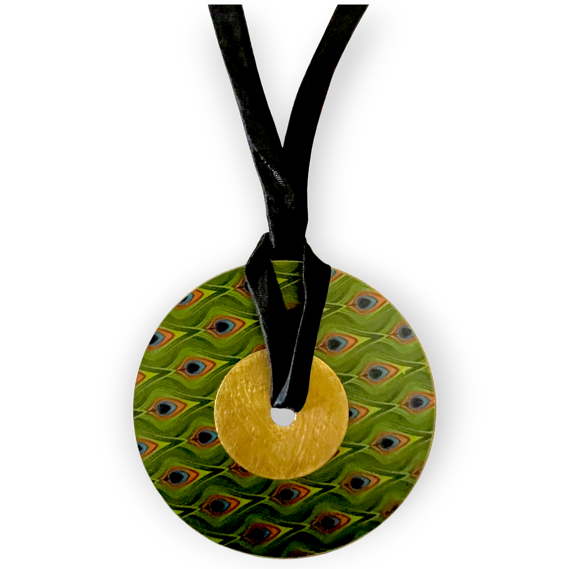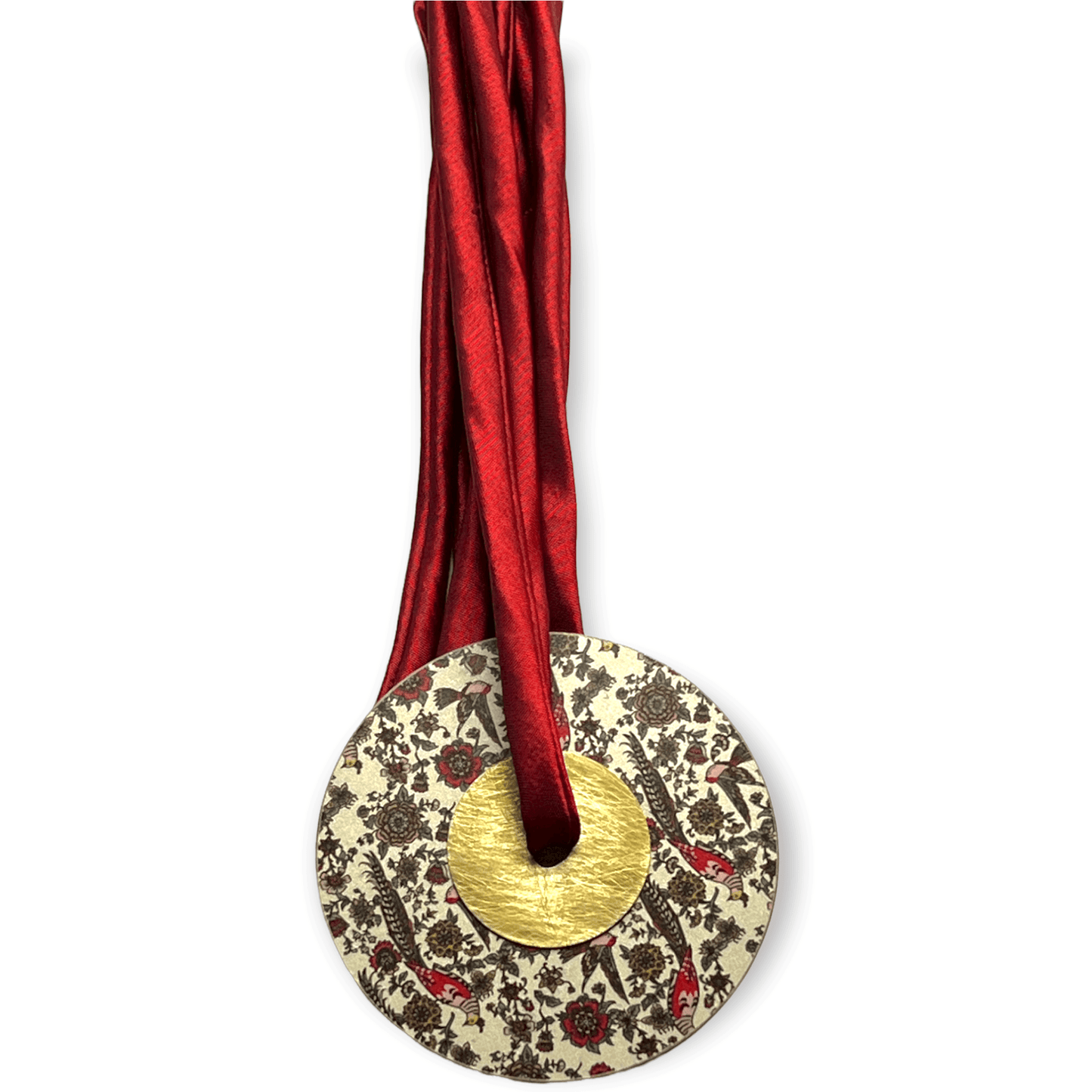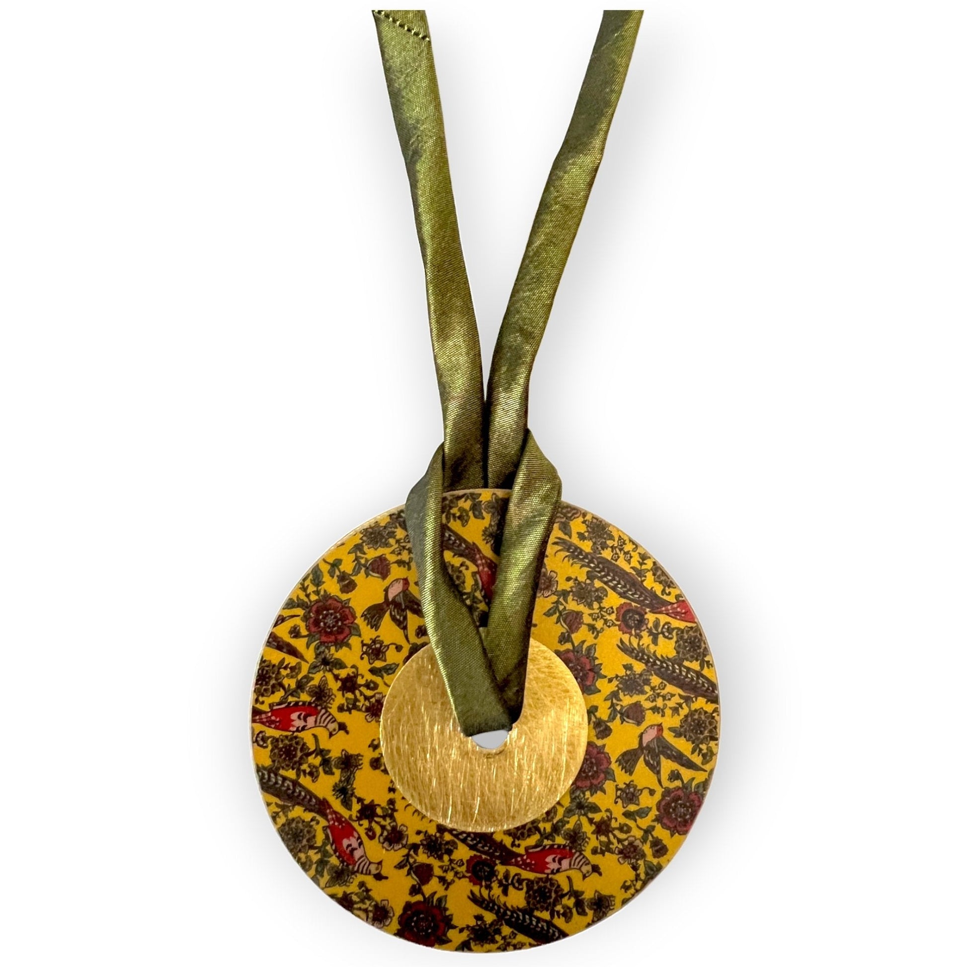 We love options—and this wanderlust-inducing statement piece delivers on all fronts. Designed to be worn as either a bold necklace or a chic belt, this handcrafted accessory offers ultimate versatility. Suspended from a soft satin cord, the large brass disk features a travel-inspired, fabric-patterned design on both sides—each side with a complementary motif from the same region, offering a reversible look to match your mood or outfit.
