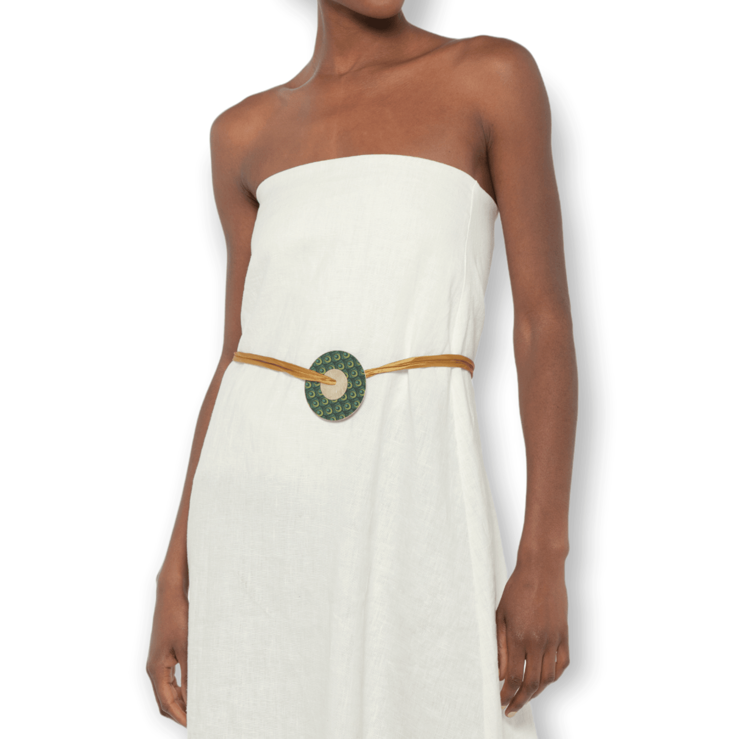 An additional smaller brass disk adds a touch of layered interest and can be removed or rearranged, giving you even more styling possibilities. Whether worn around the neck or waist, this piece is a celebration of global artistry and creativity.
