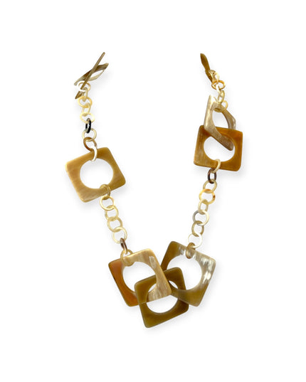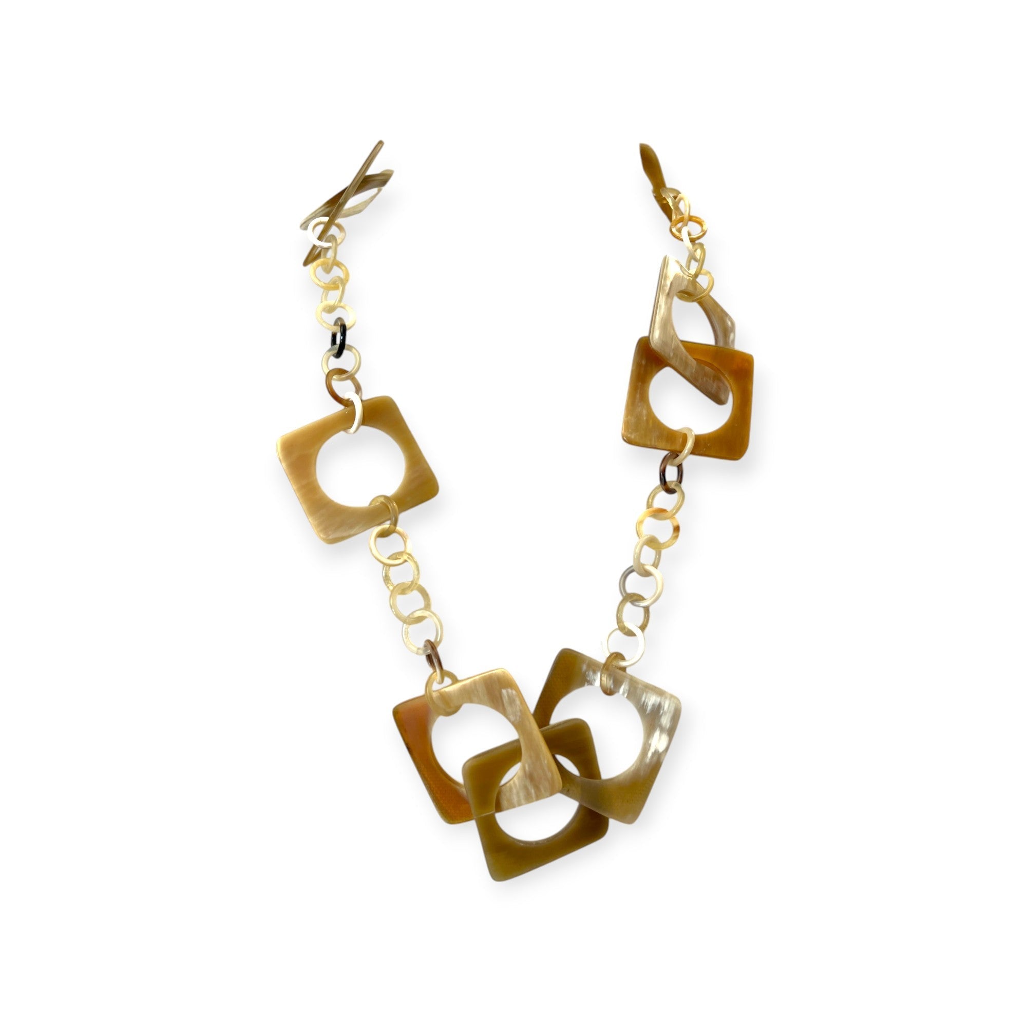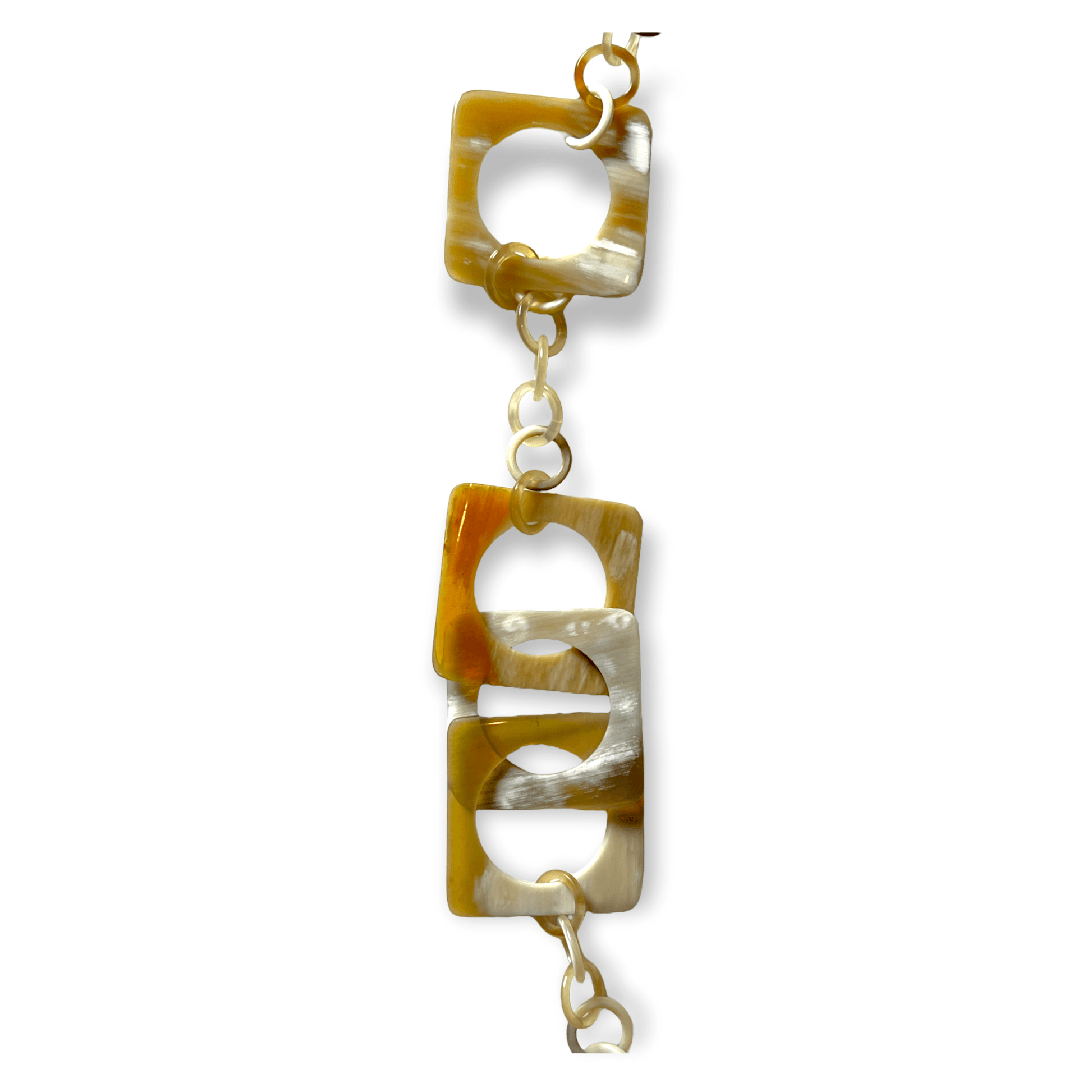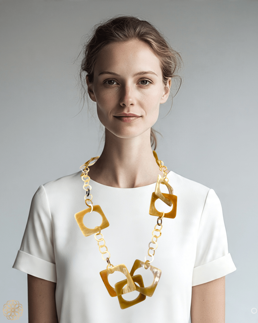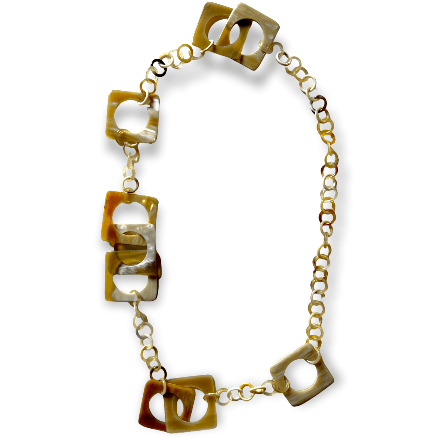 A fresh take on the classic chain link, this statement necklace combines sculptural design with the natural elegance of sustainably sourced horn. The links vary in size and shape—from bold squares with circular cutouts to smaller, rounded connectors—creating a rhythmic, modern silhouette that’s both eye-catching and versatile.