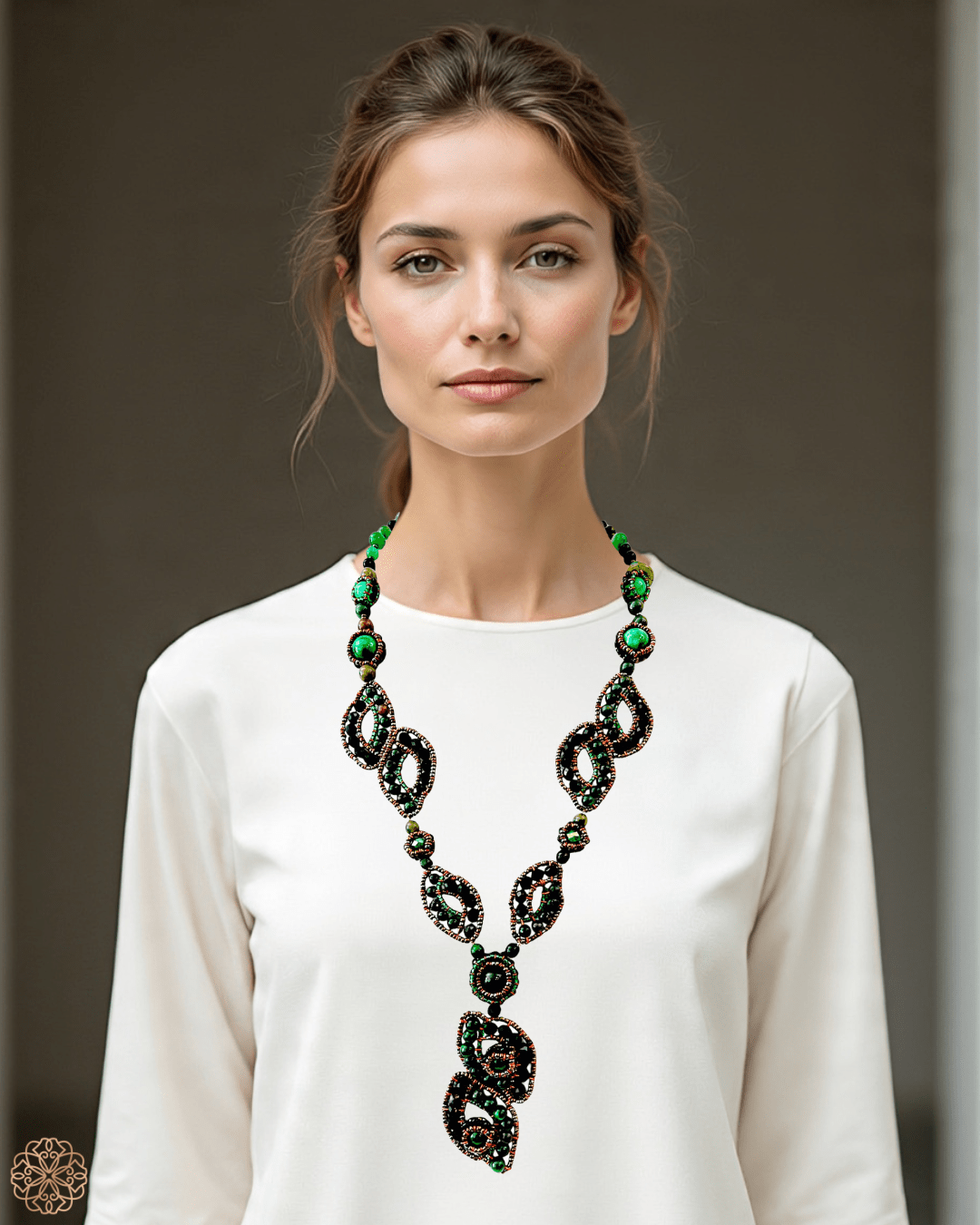 This necklace celebrates the richness of green in all its natural beauty. Handcrafted with jade and malachite, its design forms a dramatic organic pattern—woven with care and accented by seed beads that bring texture, dimension, and a touch of shimmer. The dark green palette is striking, bold yet elegant, making this piece equally suited for evening sophistication or daytime distinction.
