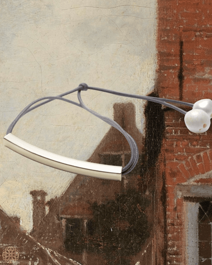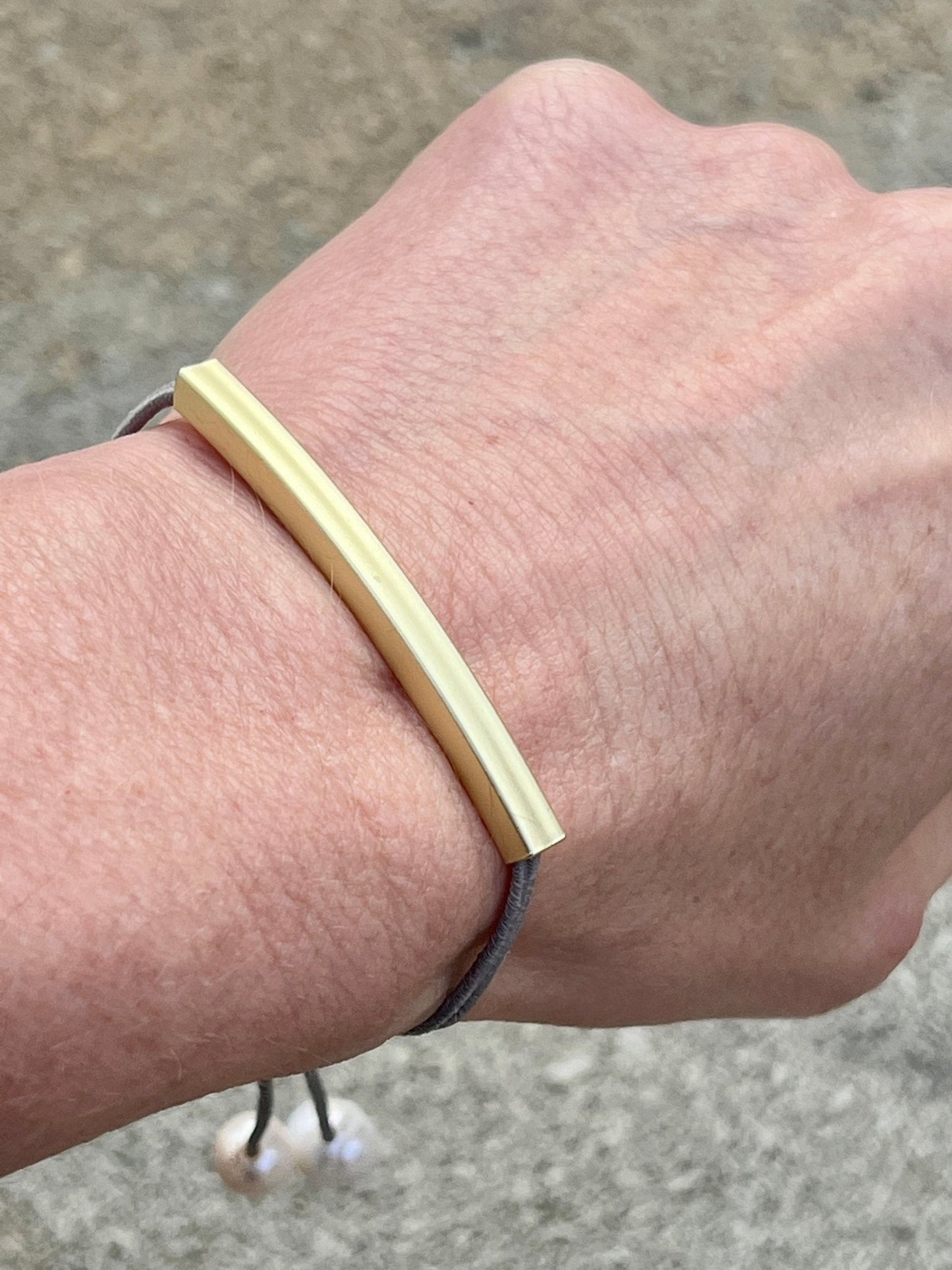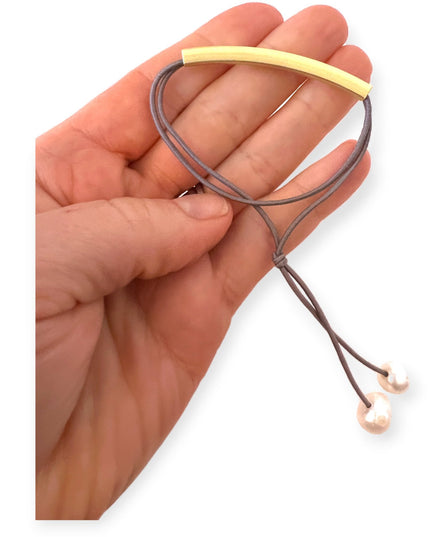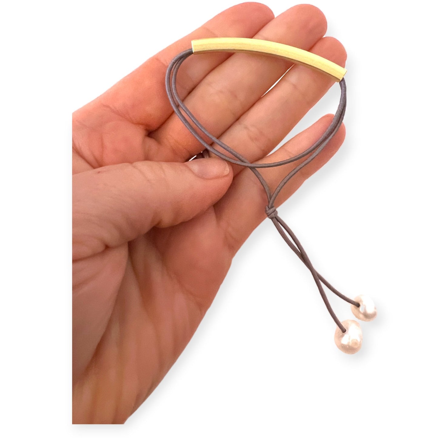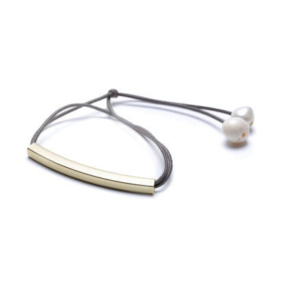 Timeless elements meet thoughtful design in this sleek, modern bracelet. A duo of luminous freshwater pearls is anchored by warm brass accents and connected with a soft grey elastic strap—offering a snug, comfortable fit that slips on with ease.
