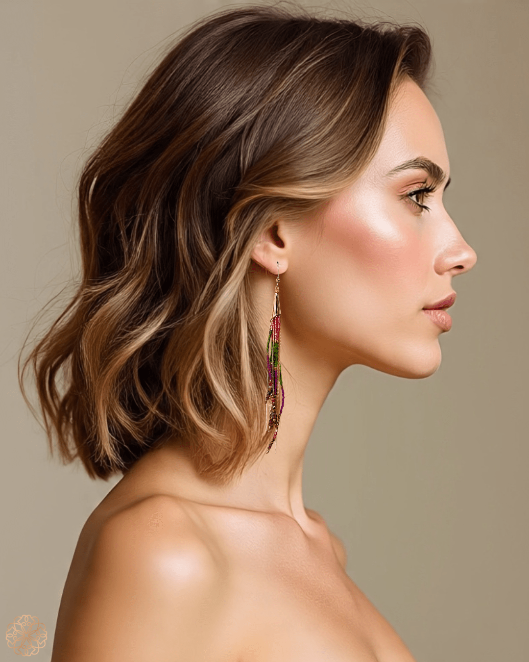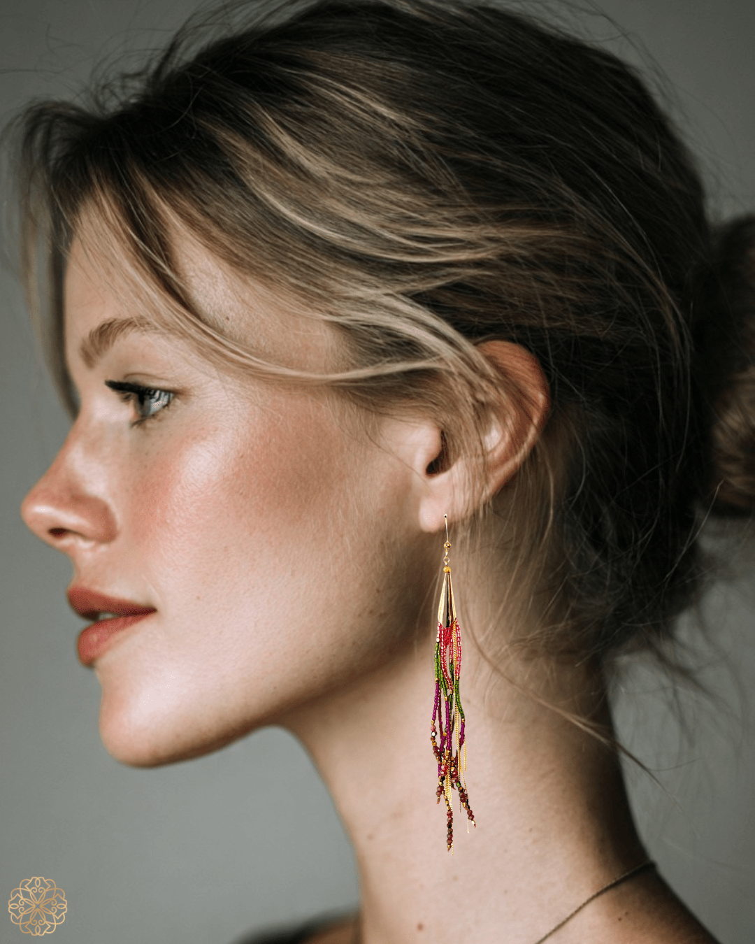 Designed as a fluid, elegant cascade, these earrings feature richly hued beads interspersed with slender metal strands, creating dynamic movement and contrast. The result? A look that’s effortlessly dramatic yet incredibly refined, perfect for turning heads while staying easy to wear.